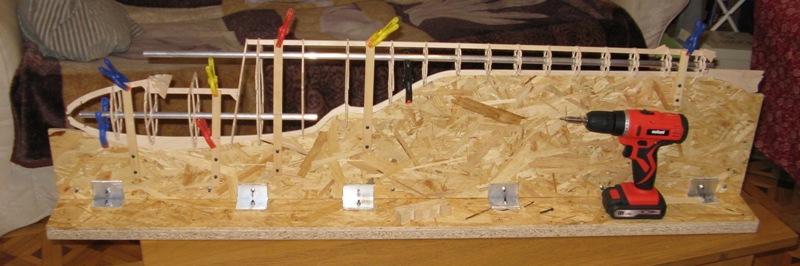 Heling do kadłuba wykonany z płyty zakupionej w markecie ( tną na wymiar niewielkie koszta) obciążony podstawą z płyty meblowej + stopki z filcu . Stoi mocno i stabilnie dobrze się montuje kadłub. Widać wielkość w porównaniu do wkrętarki.