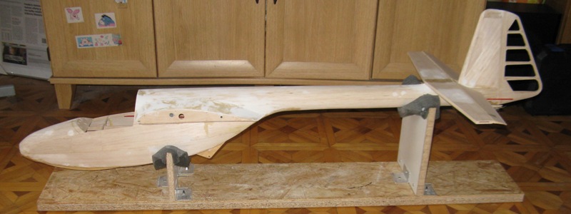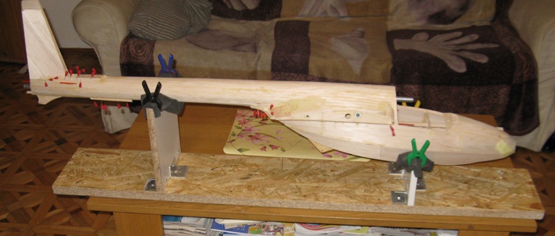 Taki stolik montażowy okazał się bardzo dobry. Kładziemy na boku (ale tak aby kadłub nie leżał na stole, podłożyłem słupki)