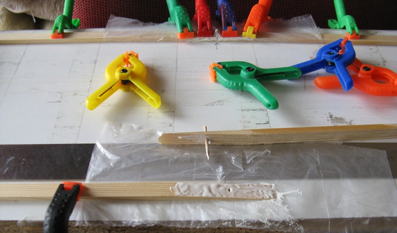 Skleiłem listwy na zakładkę, dociśnięte do metrowego liniału, aby były na pewno proste. Listwy mają to do siebie, że się rozjeżdżają. Więc zostały zakołkowane.