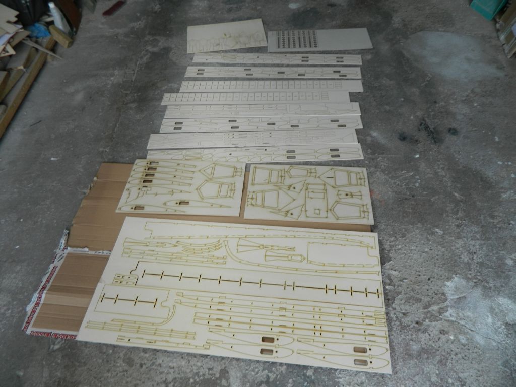 Skrzydło już na formatkach. Trochę tego jest, nominalnie:6 desek balsy 2 mm, 2 deski balsy 3 mm i parę elementów na balsosklejce 3 mm i sklejce lotn 3 mm, kawałek sklejki 2 mm. Zobaczę, może też jeszcze będą części ze sklejki 0,6 mm. Wszystko zależy jak laser wytnie ;) . Dzisiaj siadam do rozkładania kadłuba i poziomego.