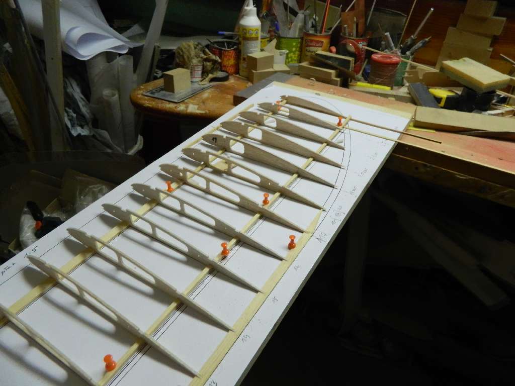 Zrobiłem pięć brakujących żeberek na eliptyczną końcówkę płata. Narazie na "sucho" przyłożone do dźwigarków. Kolejnym etapem będą lamele natarcia i spływu.