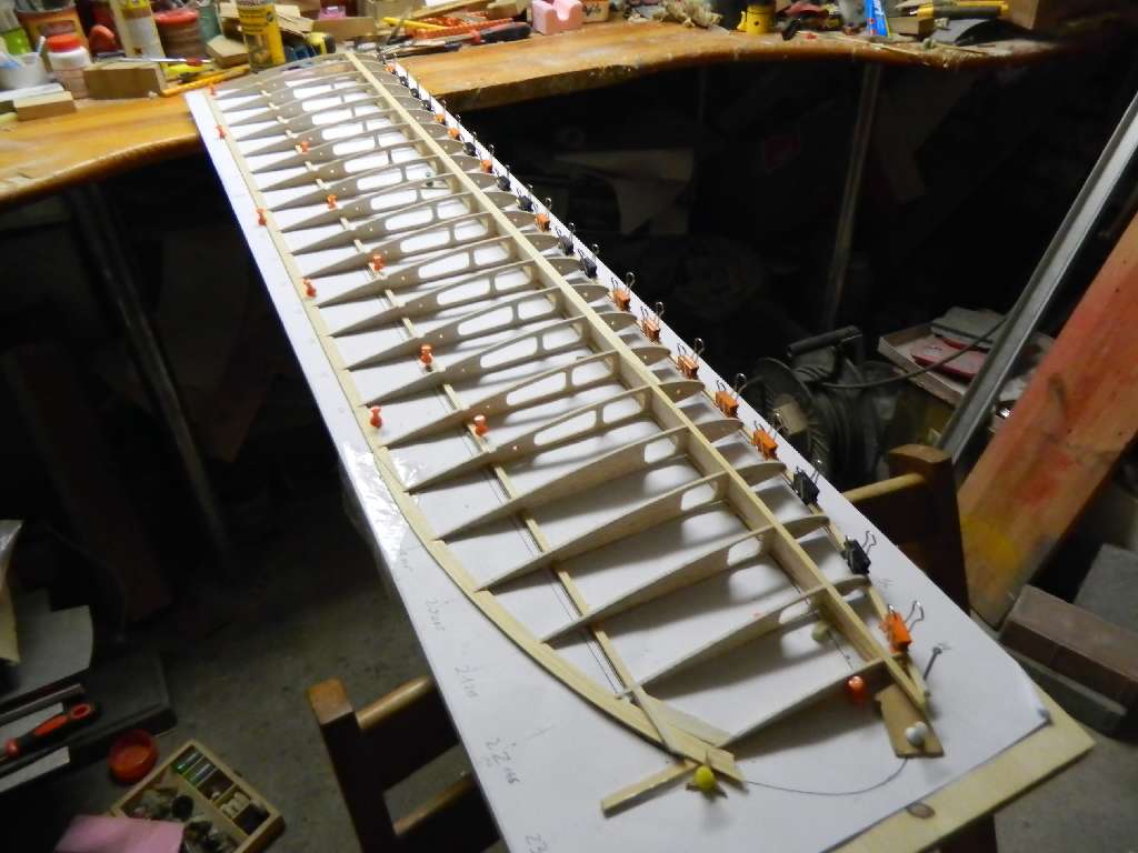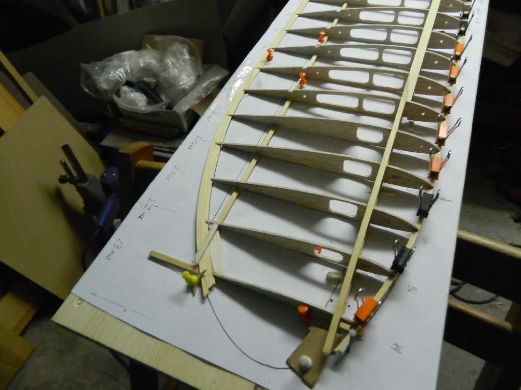 Wylamelowałem eliptyczną część spływu z 5-ciu listewek sosnowych 2x2, natarcie lamelowałem na płacie z dwóch listewek 3x2.....została końcówka płata, zrobię ją prawdopodobnie ze sklejki.