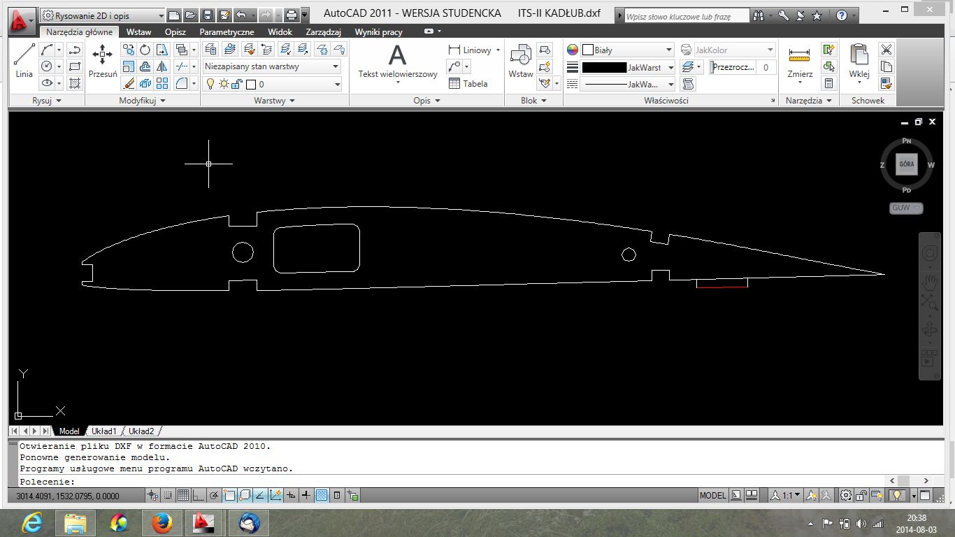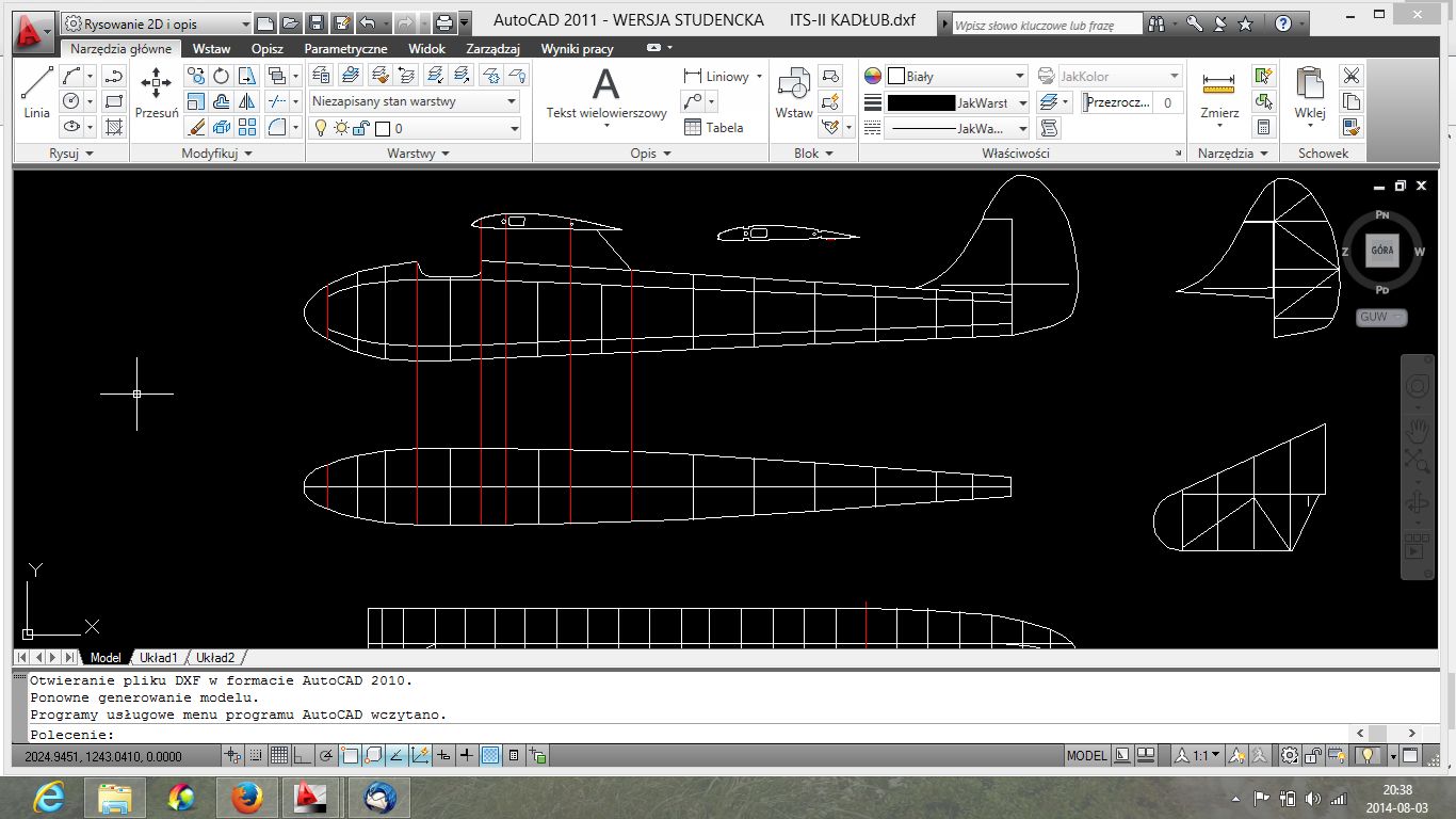To co do tej pory zbudowałem, czyli płat, idzie do kosza. No nowo rozrysowałem cały model, zmieniając projekt wstępny, który opisywałem wcześniej. Zmiany te dotyczą: inny profil, zamiast MS3-11 Retro, zastosuję S7055, odchodzę od pracochłonnych sklejkowych kesonów na normalne balsowe /balsa 1,5 mm/. Reszta zasadniczo pozostaje bez zmian, chociaż będę starał się maksymalnie uprościć konstrukcję. Szybowiec rysuję w autocadzie, wszystkie żeberka i wręgi będę dawał na laser. Dodatkową zmianą będzie zamontowanie haka do holu za modelem. Skala oczywiście ta sama 1:5 i model w kolorach materiałów.