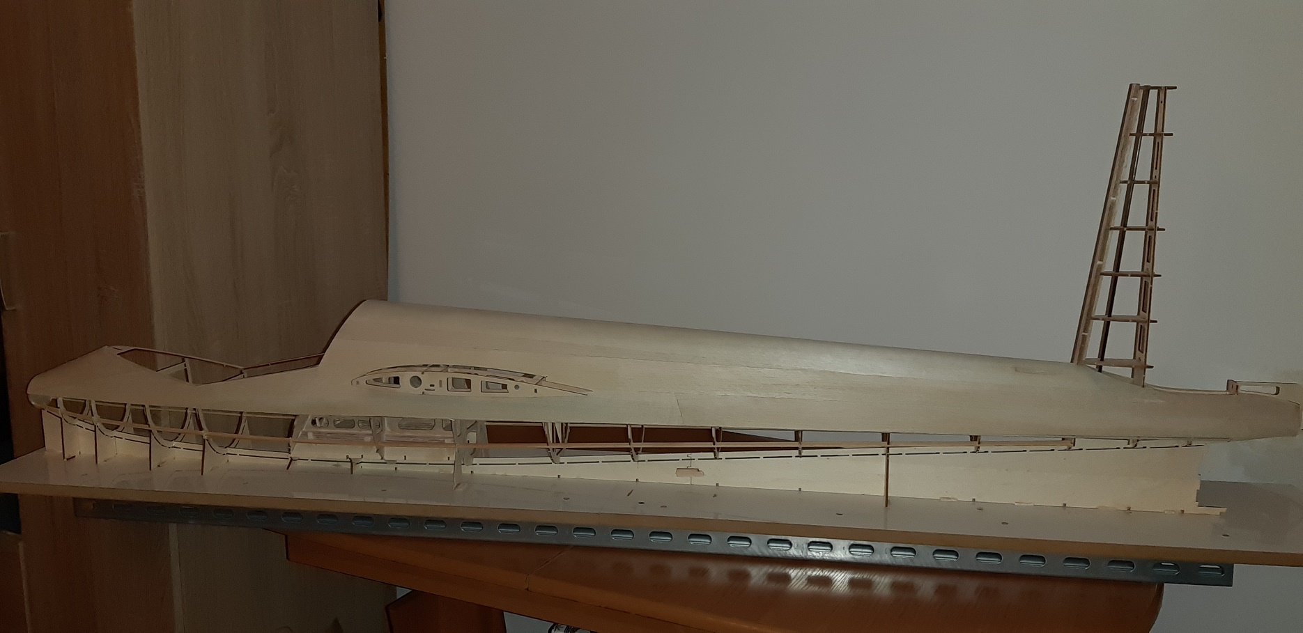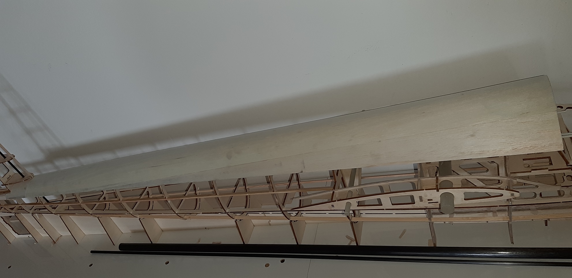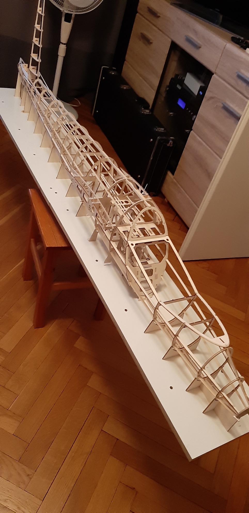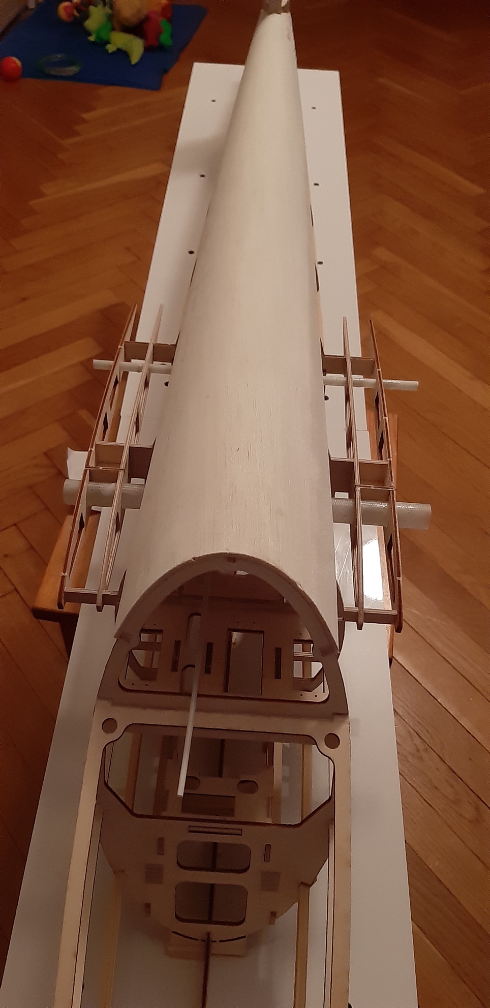 Skleiłem z dwóch desek balsy 2,5mm większą  formatkę na górne pokrycie kadłuba. Jest to jeden z trudniejszych do wygięcia elementów ponieważ jego długość to ponad 1060mm. No ale dałem radę. Płyn do okien na amoiaku jest niezastąpiony. Na zdjęciach balsa trochę ufajdana brudem od kątowników stalowych ale to żaden problem bo i tak balsa będzie szlifowana a potem pokryta laminatem.  Jak widać prefabrykat niemal sam układa się na wręgach. Jutro pewnie go przykleję.