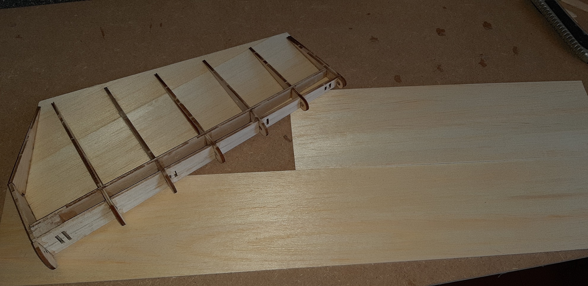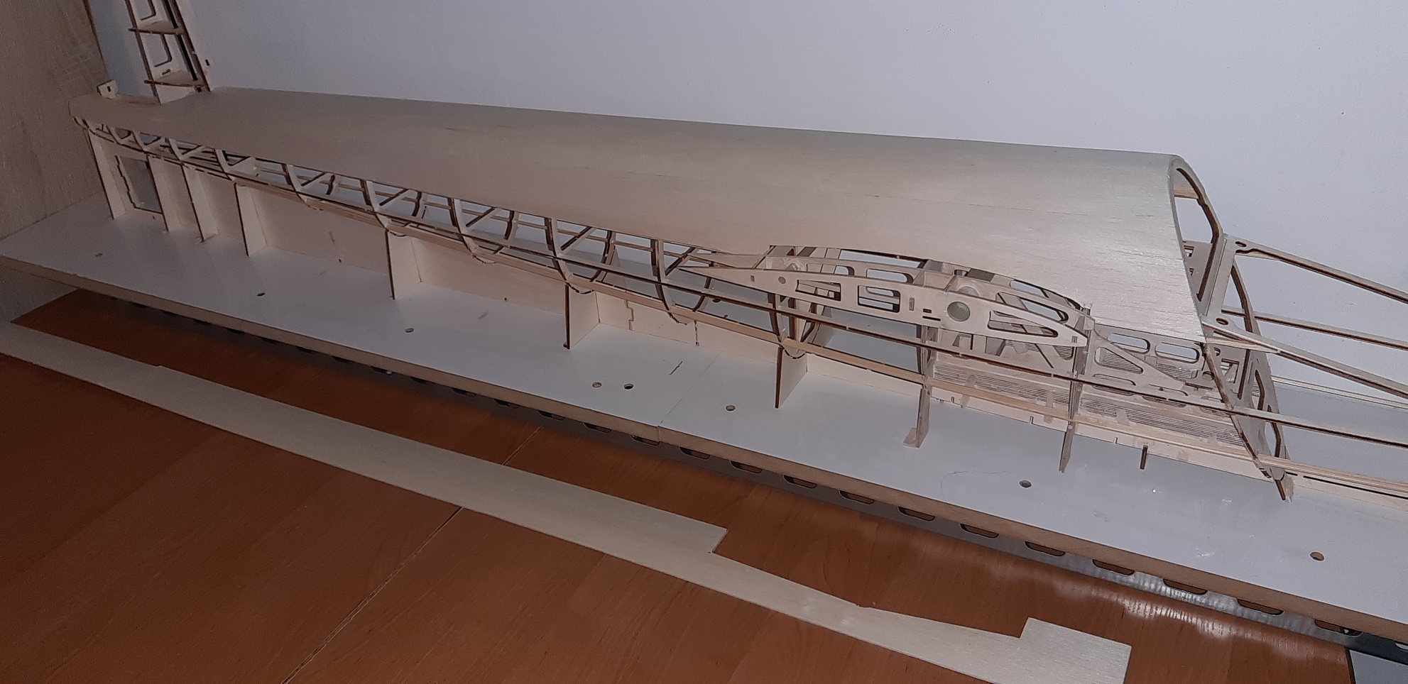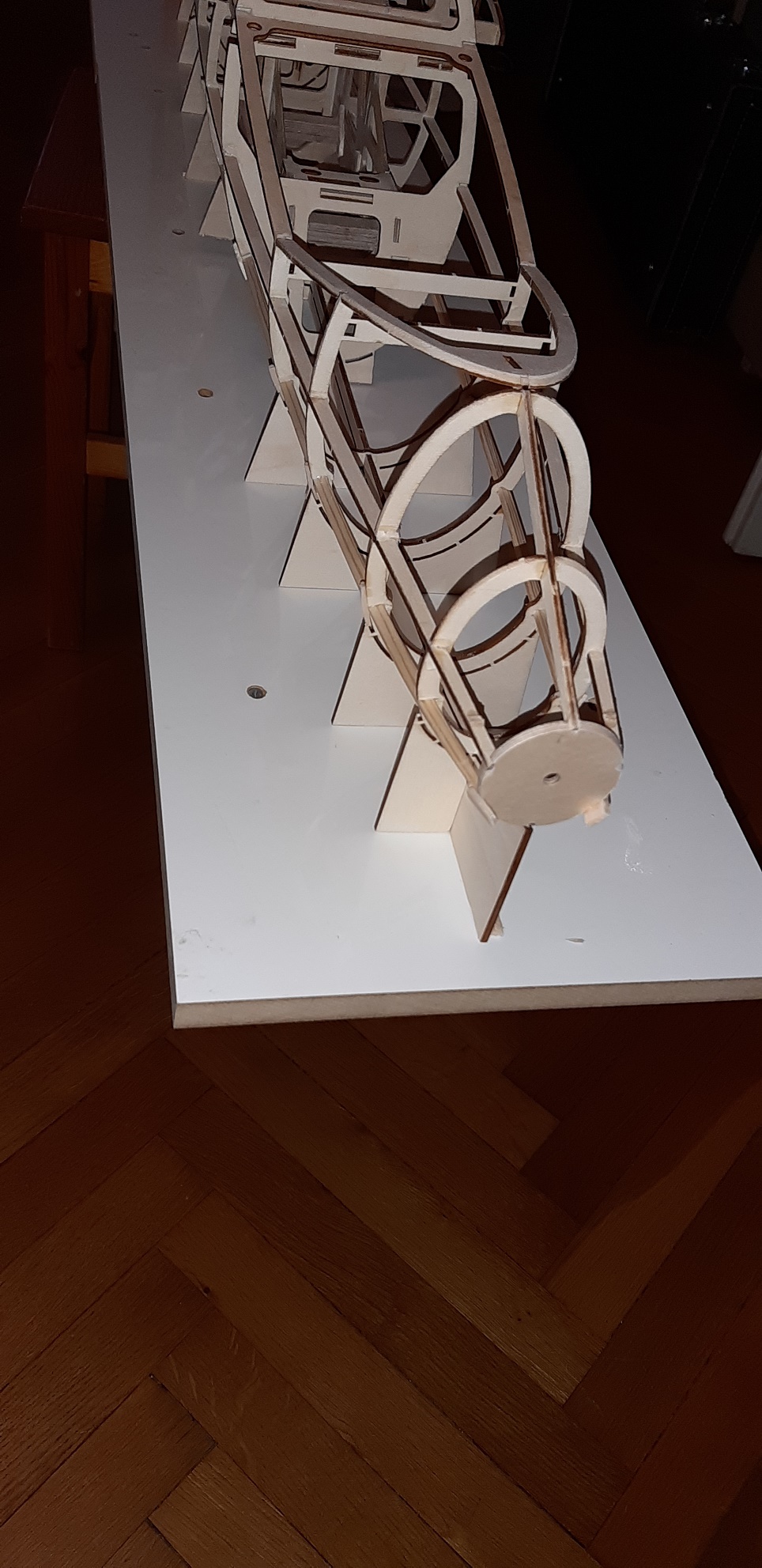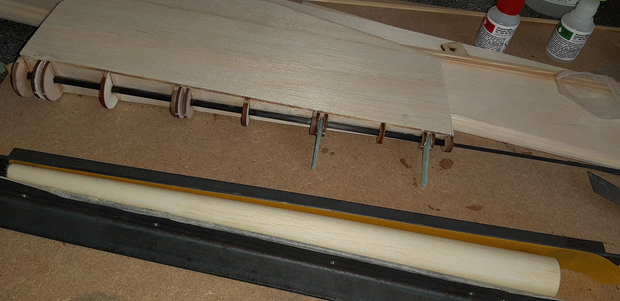 Skleiłem z dwóch desek balsy 2,5mm większą  formatkę na górne pokrycie kadłuba. Jest to jeden z trudniejszych do wygięcia elementów ponieważ jego długość to ponad 1060mm. No ale dałem radę. Płyn do okien na amoiaku jest niezastąpiony. Na zdjęciach balsa trochę ufajdana brudem od kątowników stalowych ale to żaden problem bo i tak balsa będzie szlifowana a potem pokryta laminatem.  Jak widać prefabrykat niemal sam układa się na wręgach. Jutro pewnie go przykleję.