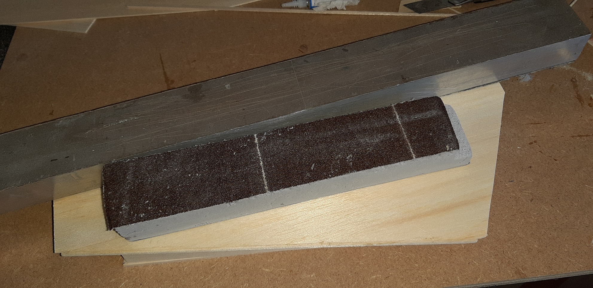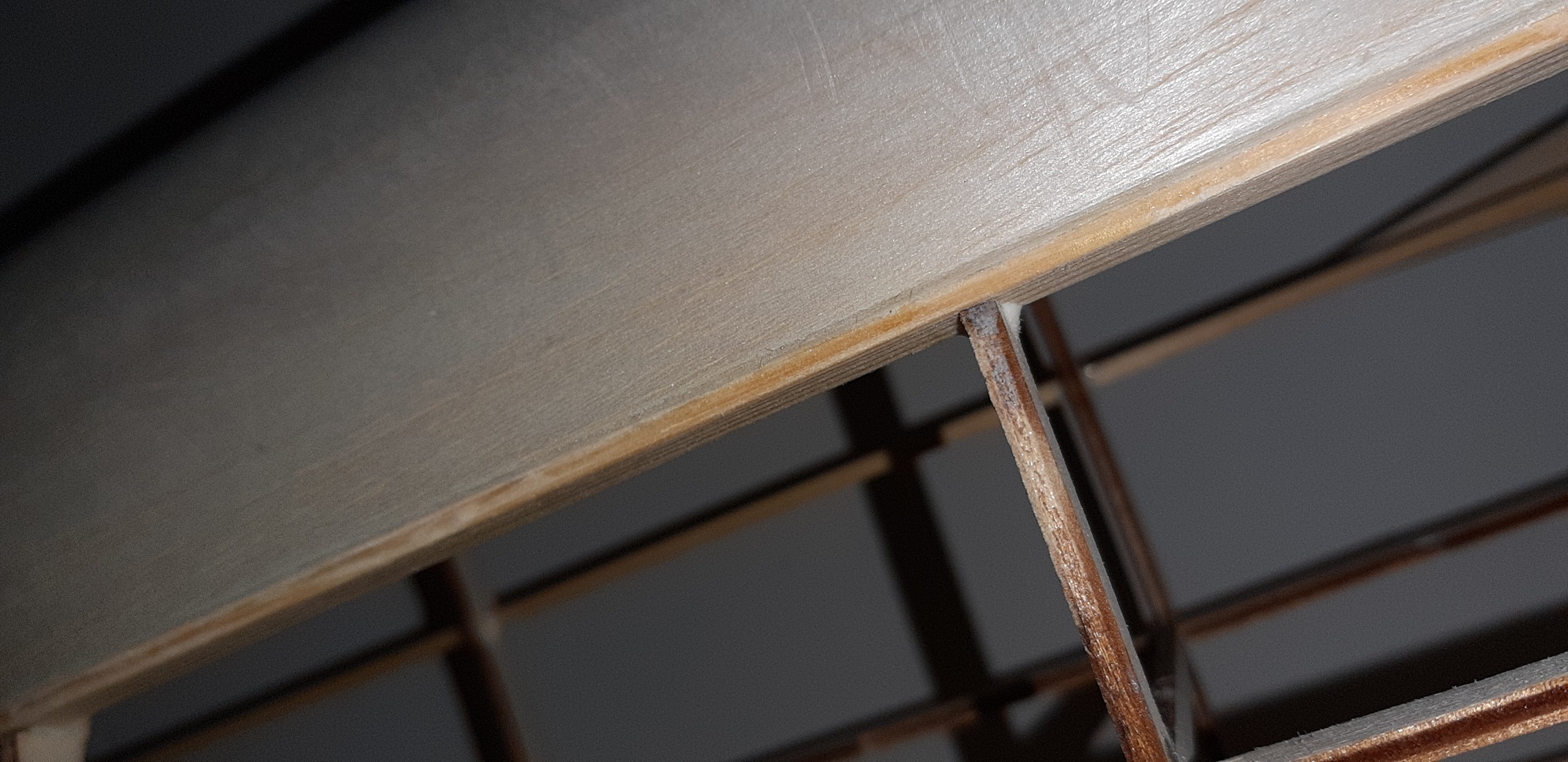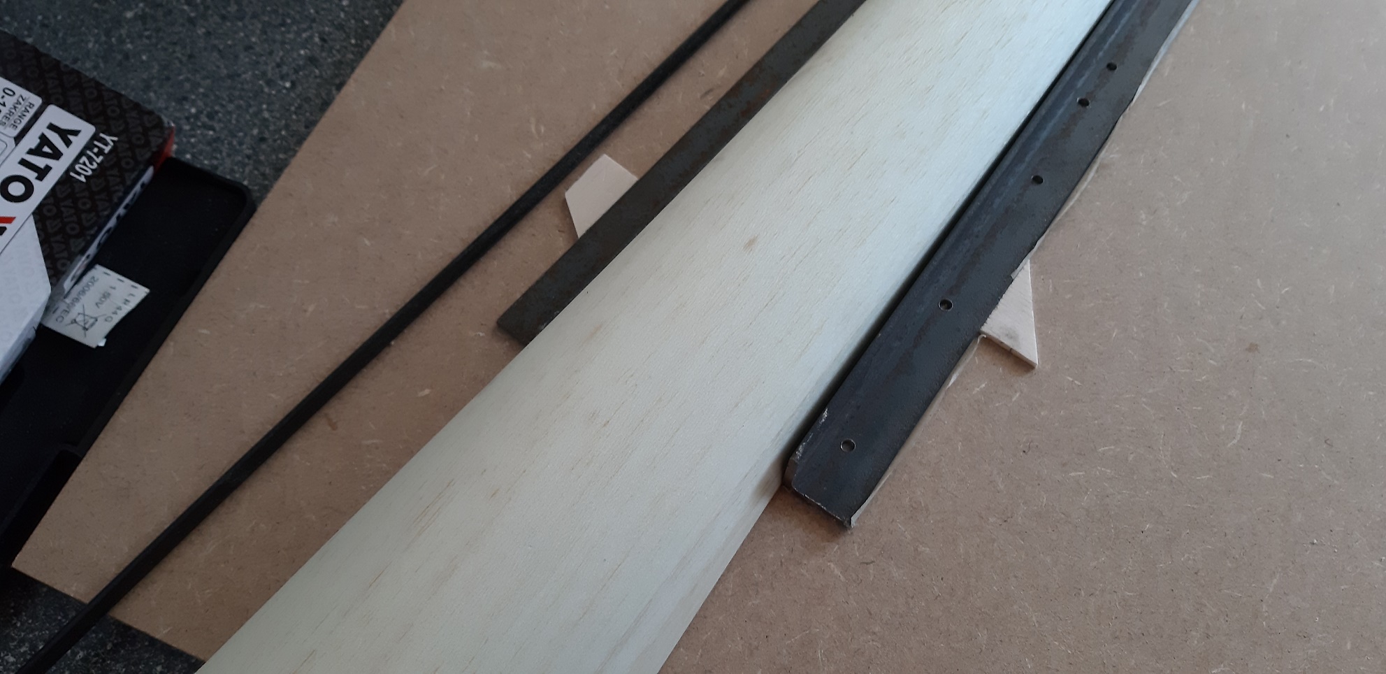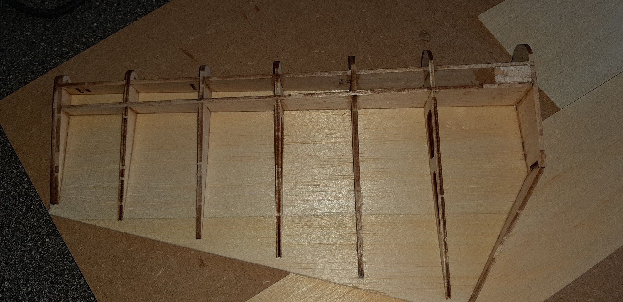 Skleiłem z dwóch desek balsy 2,5mm większą  formatkę na górne pokrycie kadłuba. Jest to jeden z trudniejszych do wygięcia elementów ponieważ jego długość to ponad 1060mm. No ale dałem radę. Płyn do okien na amoiaku jest niezastąpiony. Na zdjęciach balsa trochę ufajdana brudem od kątowników stalowych ale to żaden problem bo i tak balsa będzie szlifowana a potem pokryta laminatem.  Jak widać prefabrykat niemal sam układa się na wręgach. Jutro pewnie go przykleję.