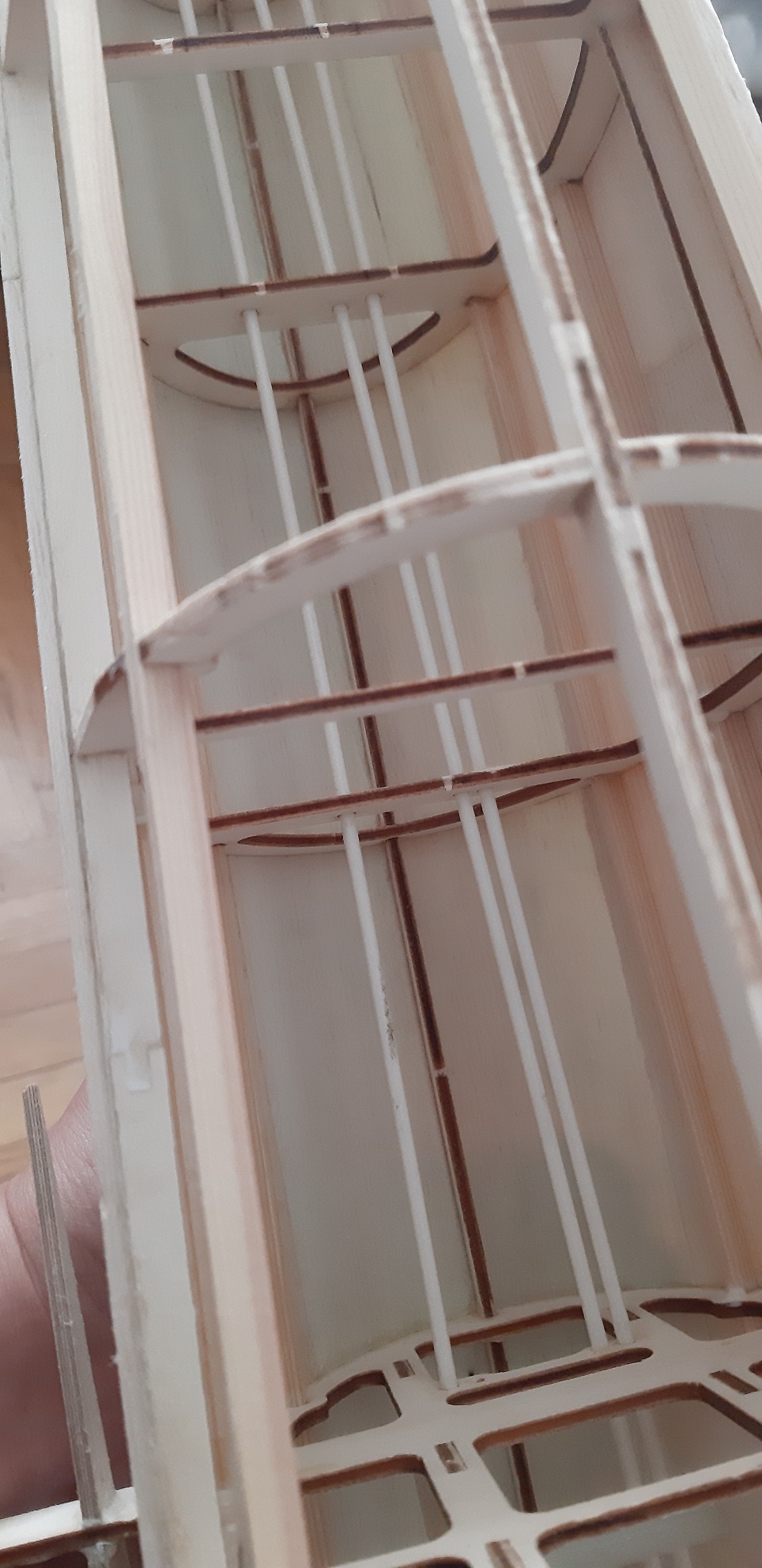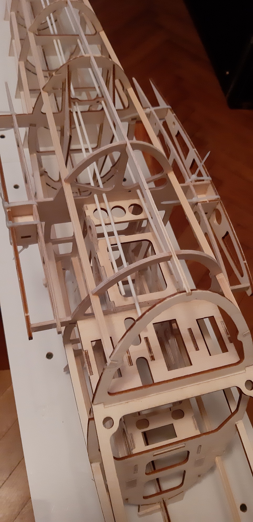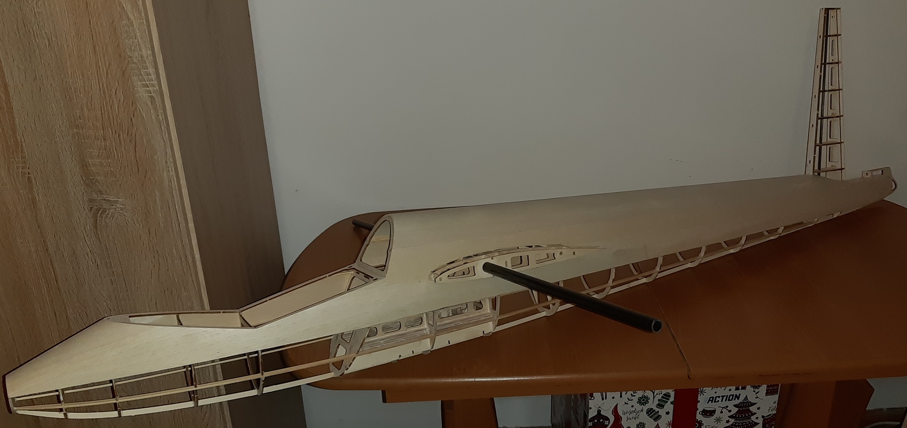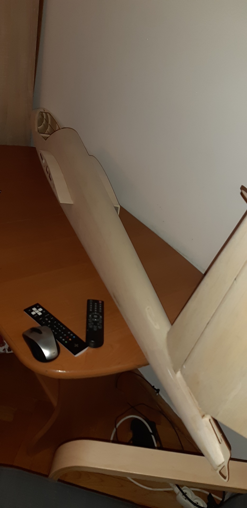 Na dziś koniec prac. Posklejałem centropłat, wręgę silnikową, wkleiłem pręt węglowy w statecznik i elementy profilujące spływ statecznika pionowego. Dodatkowo wykonałem łoże statecznika poziomego. No i wkleiłem ostatnie, najdłuzsze podłużnice. Zanim to jednak zrobiłem musiałem wygotować przez 10 minut początki listewek i powyginać je w łuki w taki sposób żeby nadać im krzywiznę pomiędzy wręgą silnikową i sąsiednią wręgą kadłuba. Przeszlifowałem górne podłużnice i teoretycznie mógłbym pokryć górę kadłuba ale przed tą operacją trzeba wywiercić otworki do mocowania serw a tego już mi się nie chce dziś robić. Zdjęcia kiepskie (komórka) .Przy tej wielkości jest problem z ogarnięciem całego kadłuba w jednym kadrze.