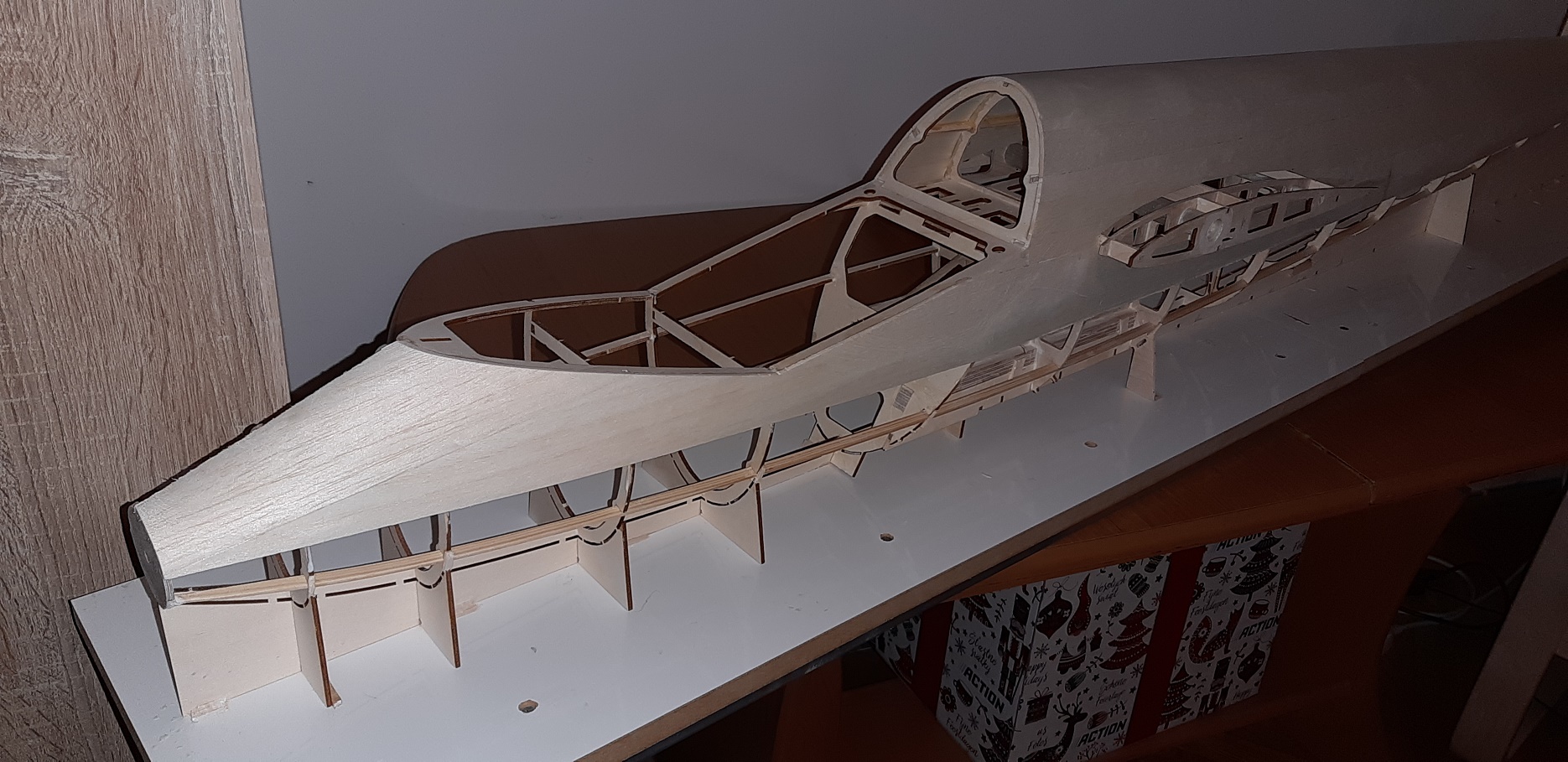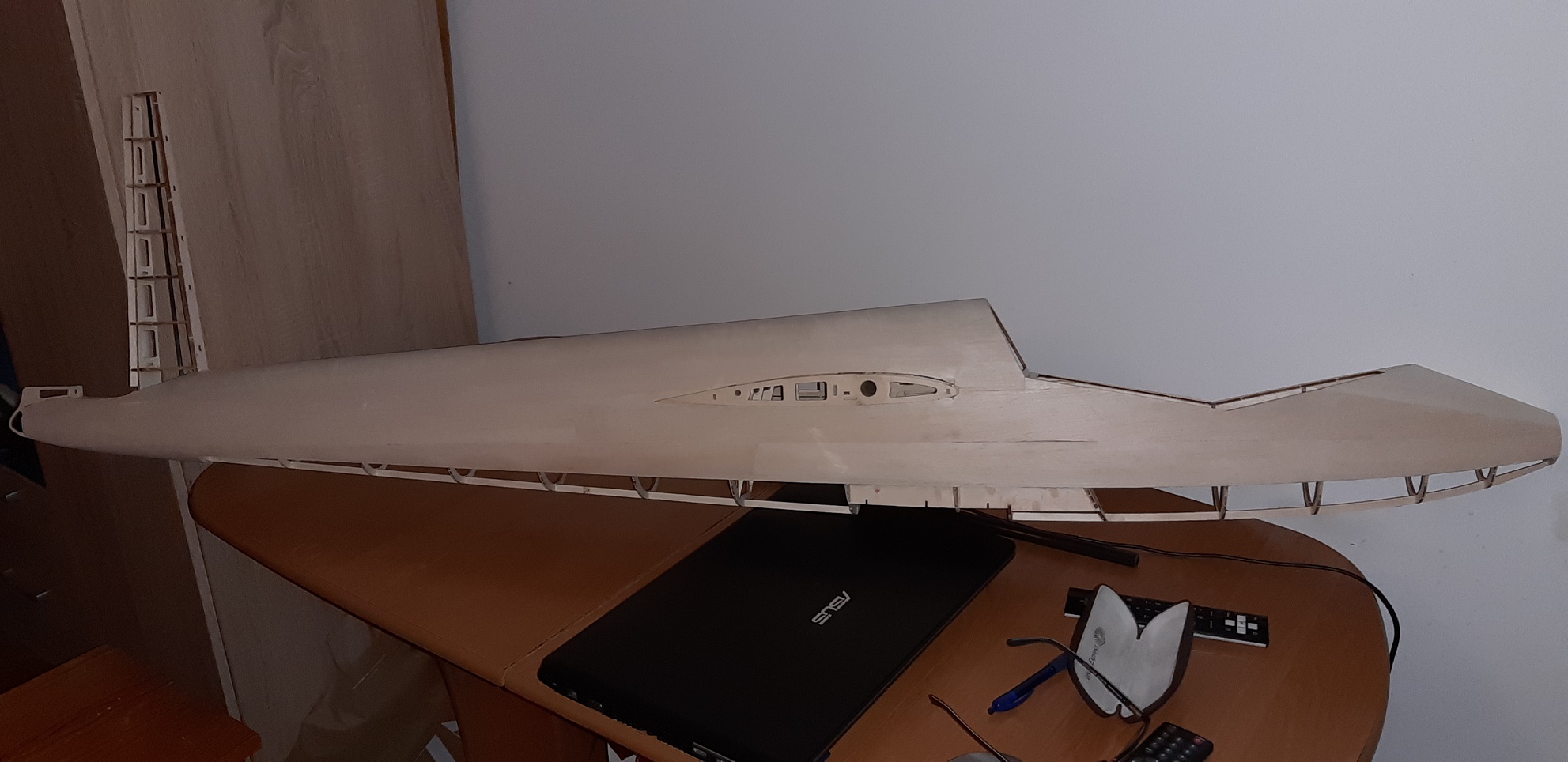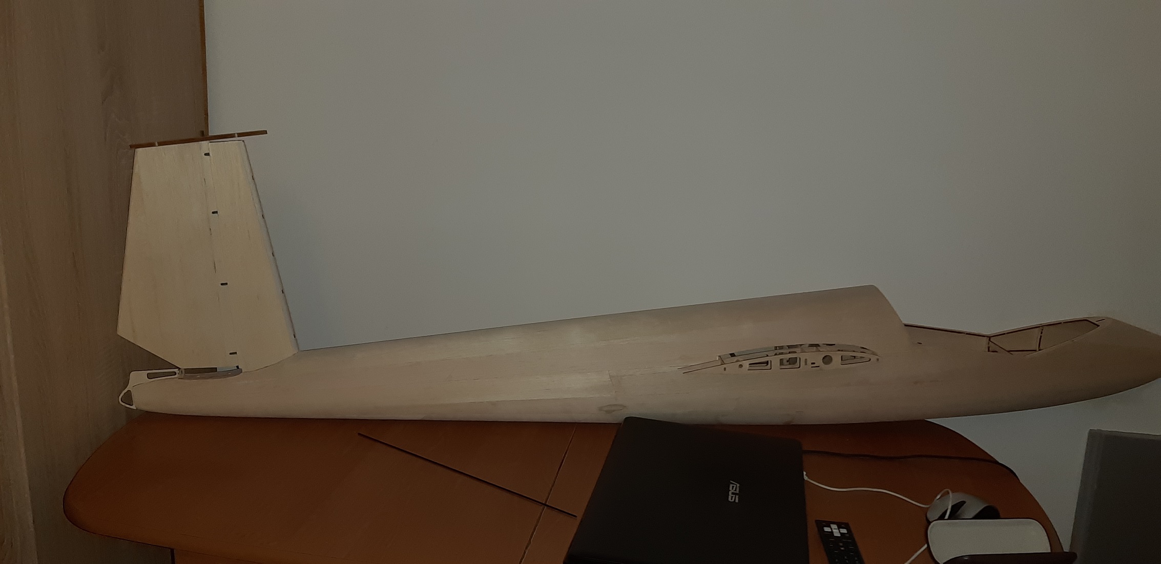 Podziałałem przy kobuzie. Jest z nim trochę roboty. Oklejanie balsą jest upierdliwe. Po oklejeniu garba sprawdziłem laserem geometrię całości. Nic się nie zwichrowało. Klepki do kadłuba kleję na średni CA. Metoda szybka i mocna. Przed szlifowaniem całości chyba pociągnę kadłub lekko żywicą L285. Usztywni to balsę i będzie lepiej szlifować. Potem położę tkaninę w okolicach 50gm2. Kadłub na chwilę obecną waży 644g i ma około 1730mm długości.