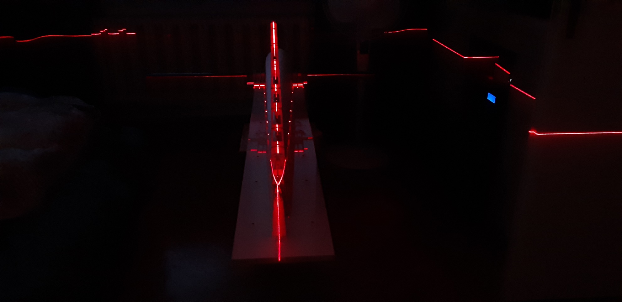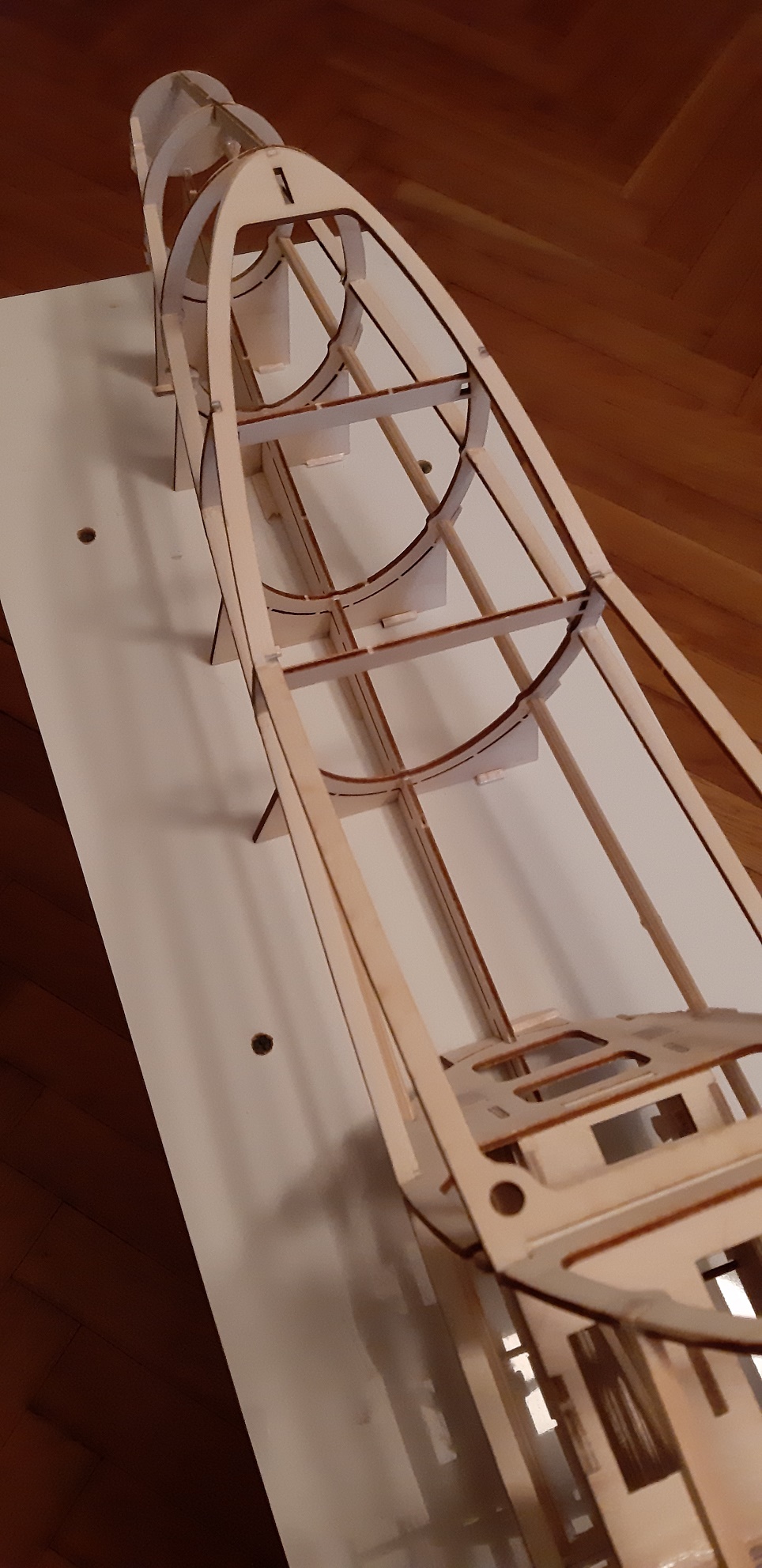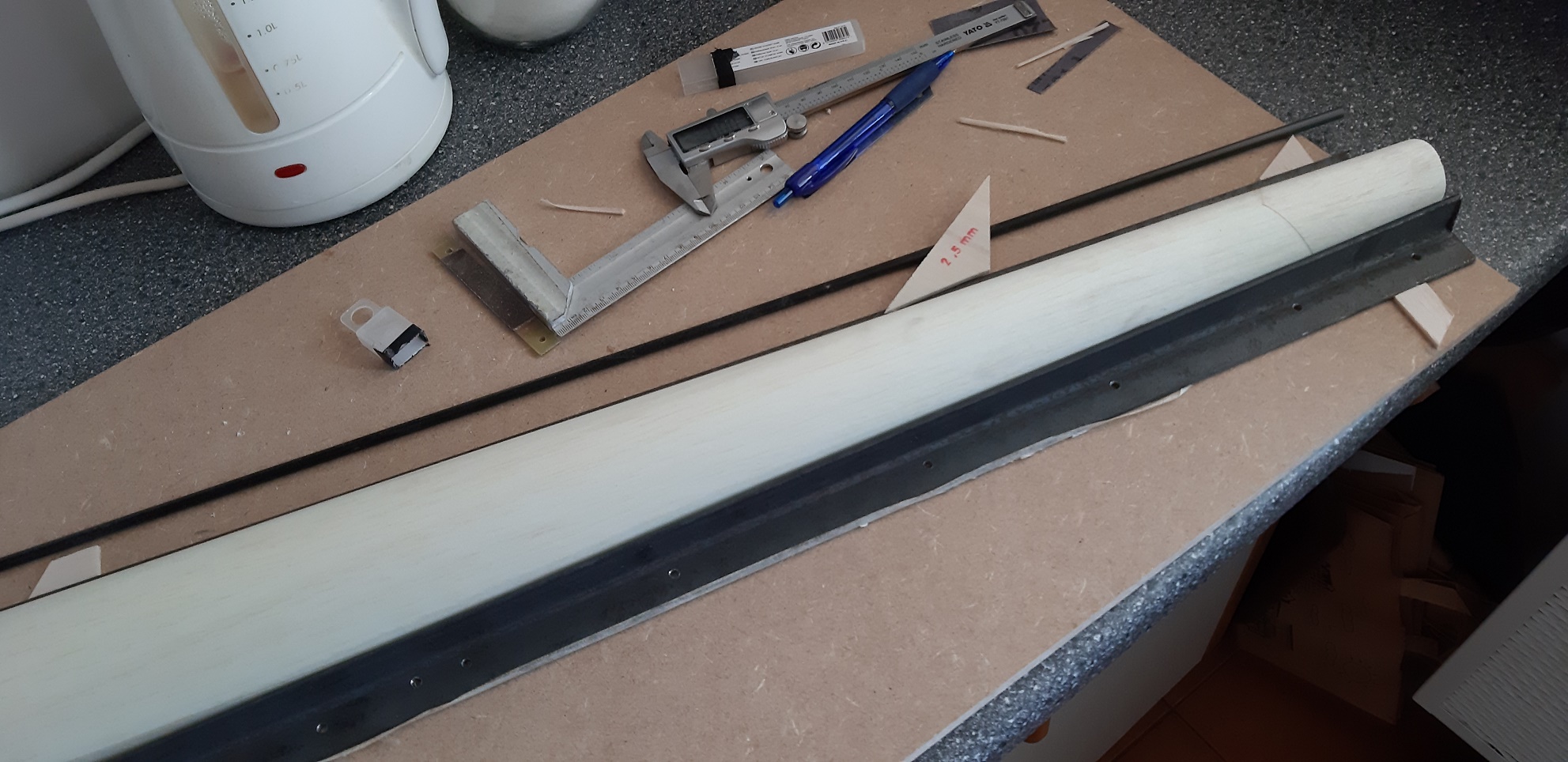 Podziałałem przy kobuzie. Jest z nim trochę roboty. Oklejanie balsą jest upierdliwe. Po oklejeniu garba sprawdziłem laserem geometrię całości. Nic się nie zwichrowało. Klepki do kadłuba kleję na średni CA. Metoda szybka i mocna. Przed szlifowaniem całości chyba pociągnę kadłub lekko żywicą L285. Usztywni to balsę i będzie lepiej szlifować. Potem położę tkaninę w okolicach 50gm2. Kadłub na chwilę obecną waży 644g i ma około 1730mm długości.