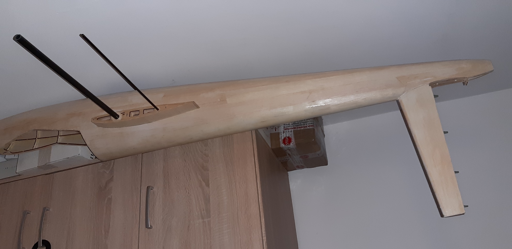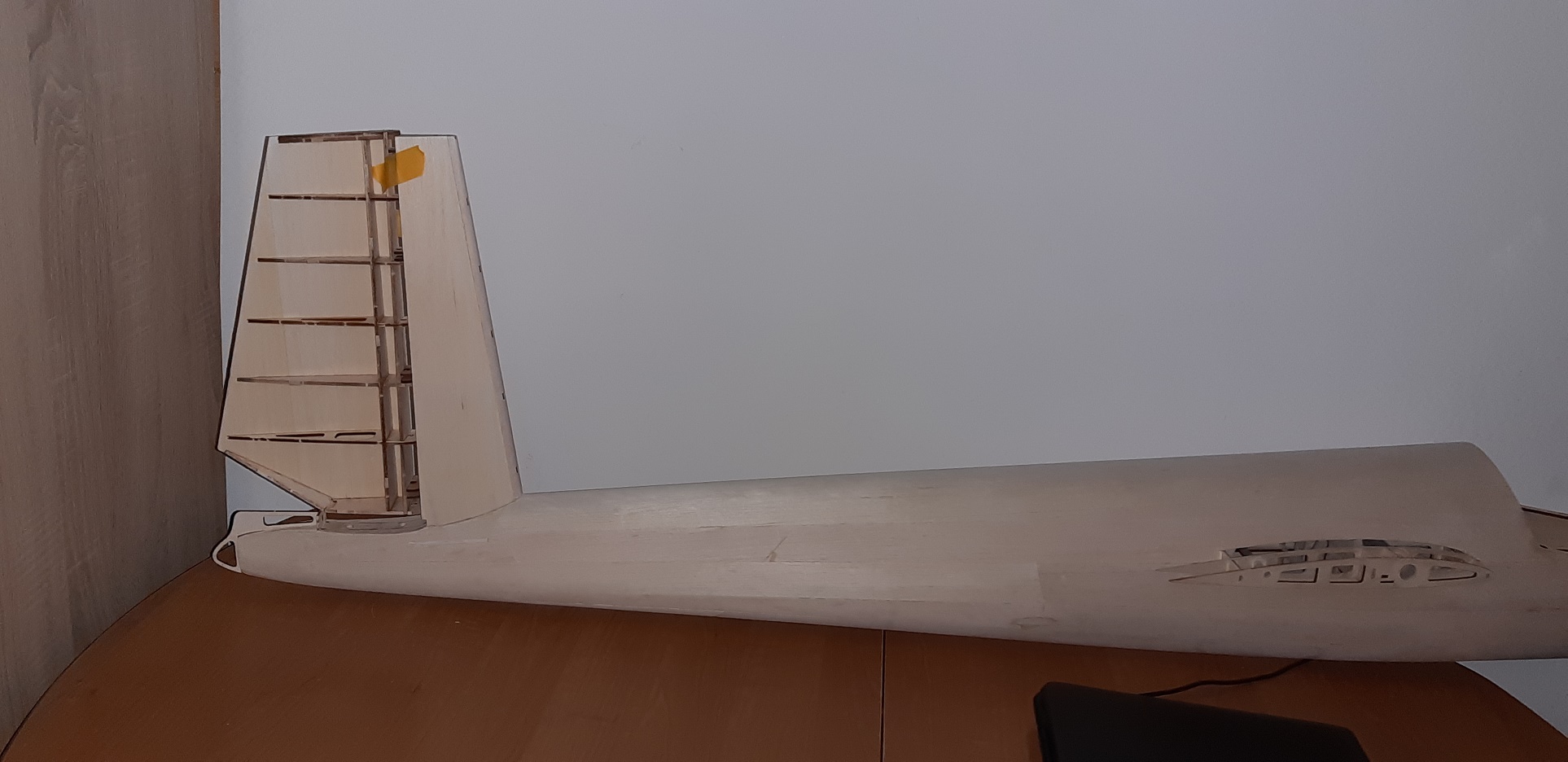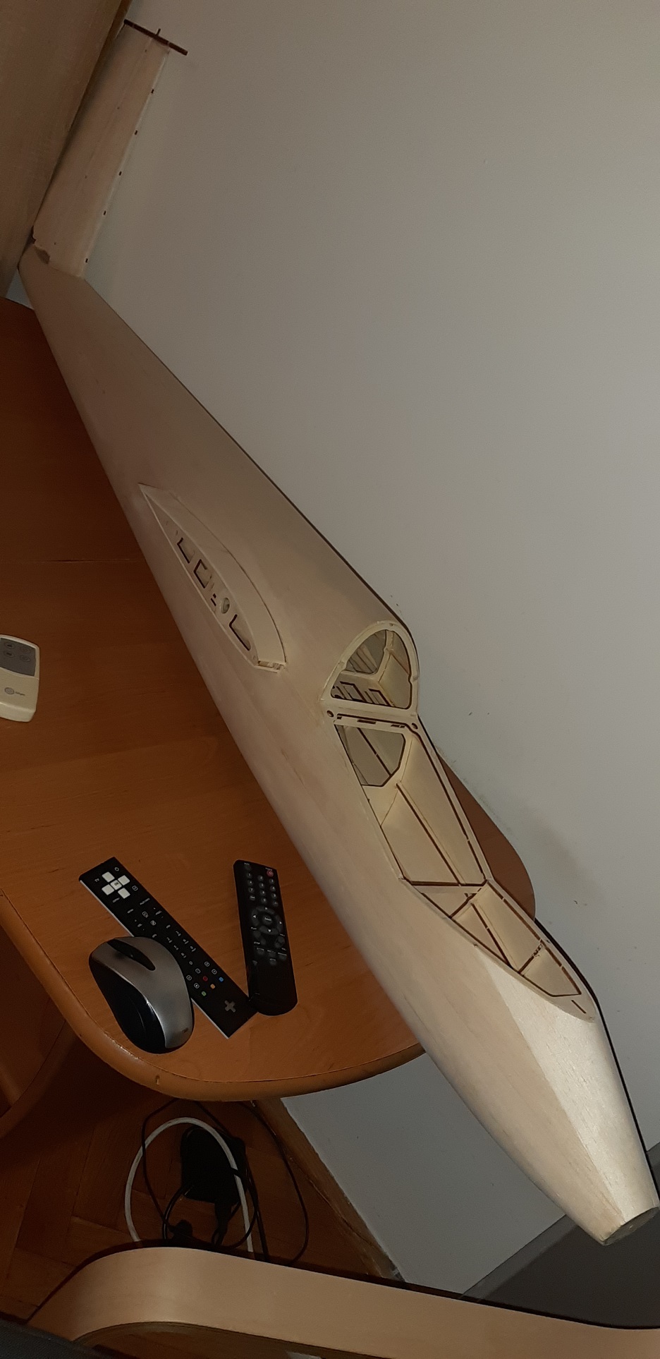 Zamówiłem balsę 1,5mm w Conradzie. Okazała się być całkiem niezła więc wykonałem pokrycie statecznika pionowego. Wcześniej wkleiłem zawiasy. Dodatkowo z zakupionej półtorówki zrobiłem pokrycie steru kierunku. Cały kadłub wstepnie przeszlifowałem, przemalowałem cieniutką warstwą żywicy. Żywicą wymalowałem również wewnętrzną cześć kabiny w celu utwardzenia balsy w szczególności miejsca w którym będzie wklejona płoza. Po związaniu żywicy przeszlifowałem delikatnie kadłub i pokryłem warstwą mikrobalonu z żywicą L285. Doskonale wypełniły się wszystkie szparki przy łączeniu klepek itp. Niestety, taka szpachla pomimo że lekka jest dość trudna w szlifowaniu wymaga trochę pracy. Jutro się za to zabiorę. Po szlifowaniu położę na całość tkaninę i zalaminuje.