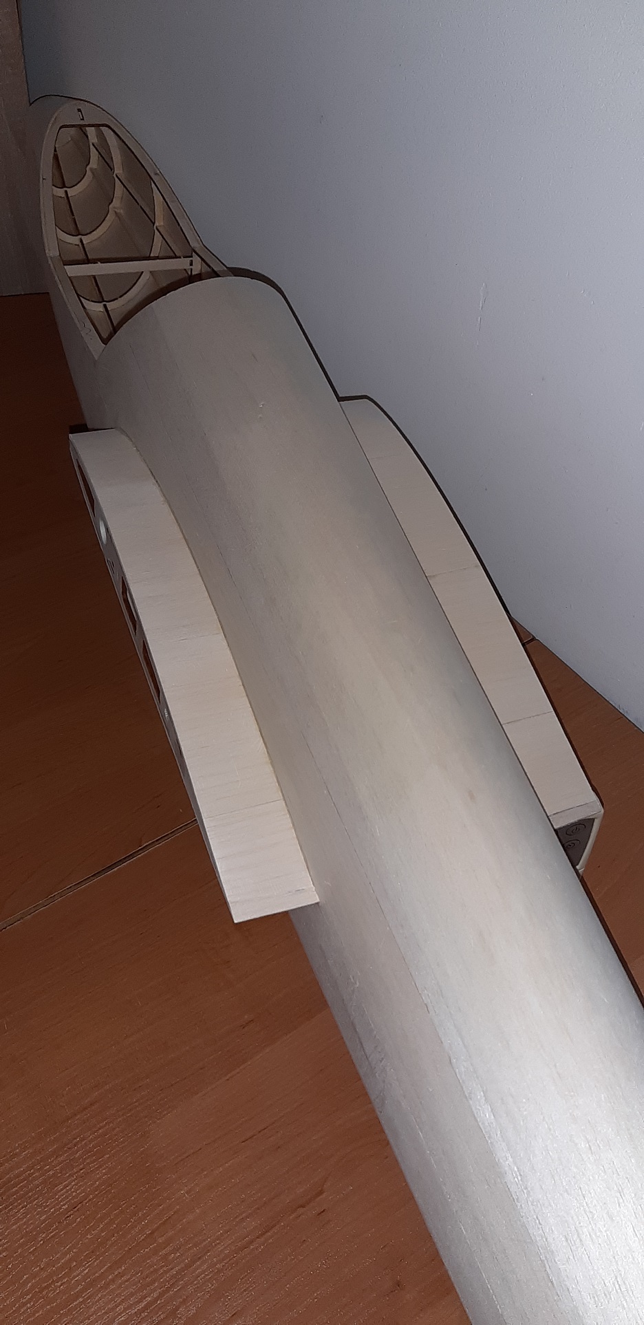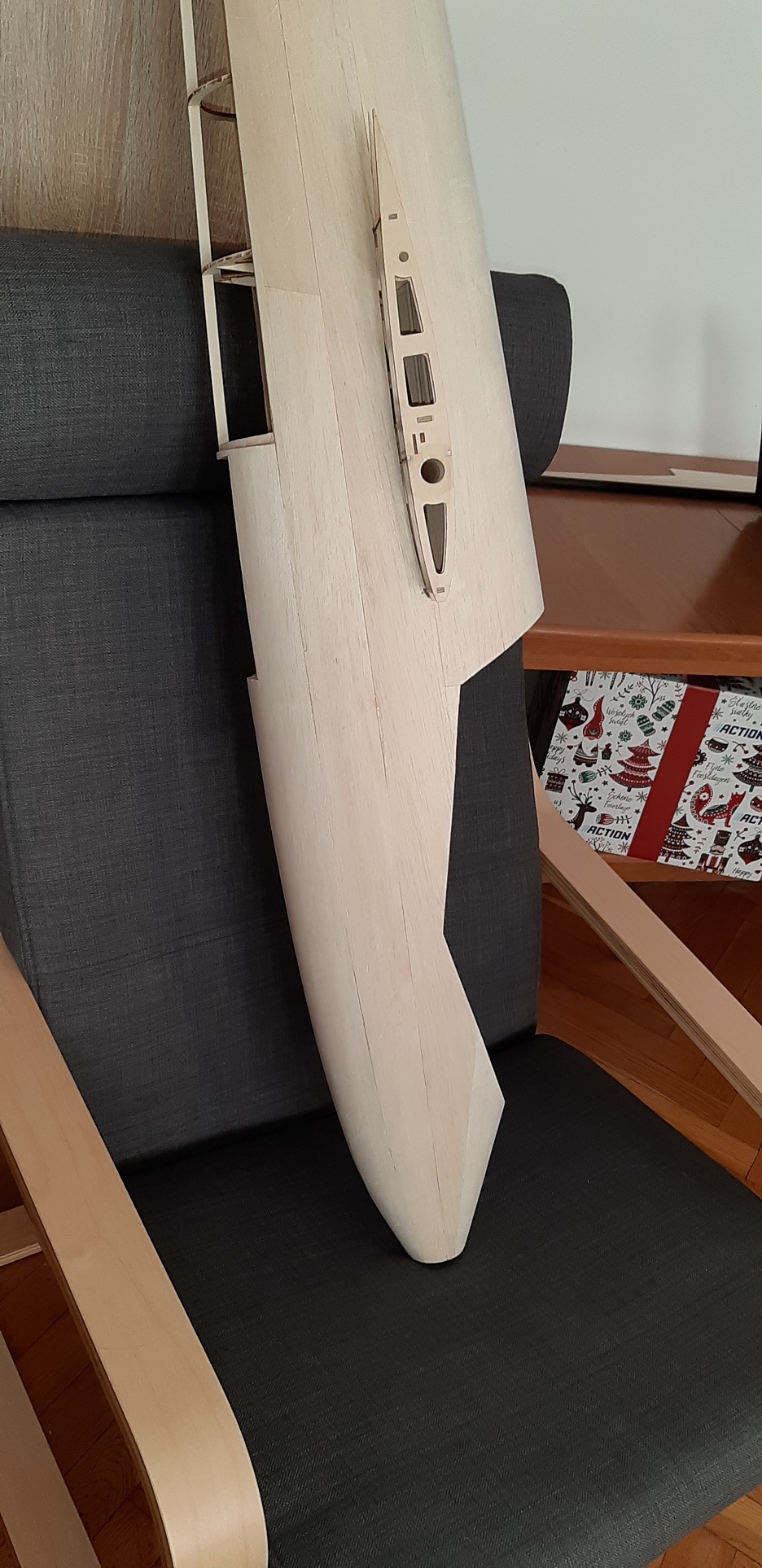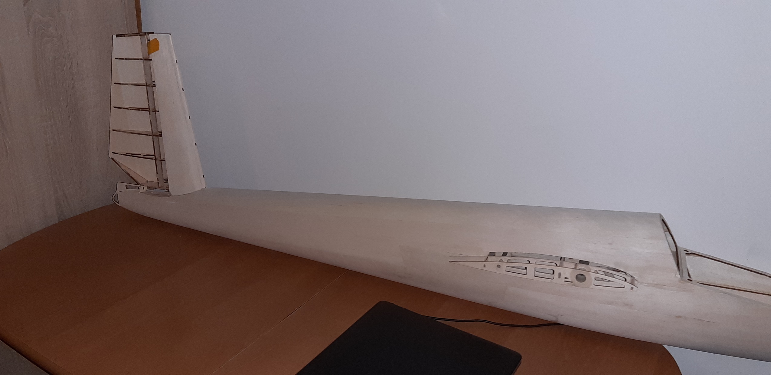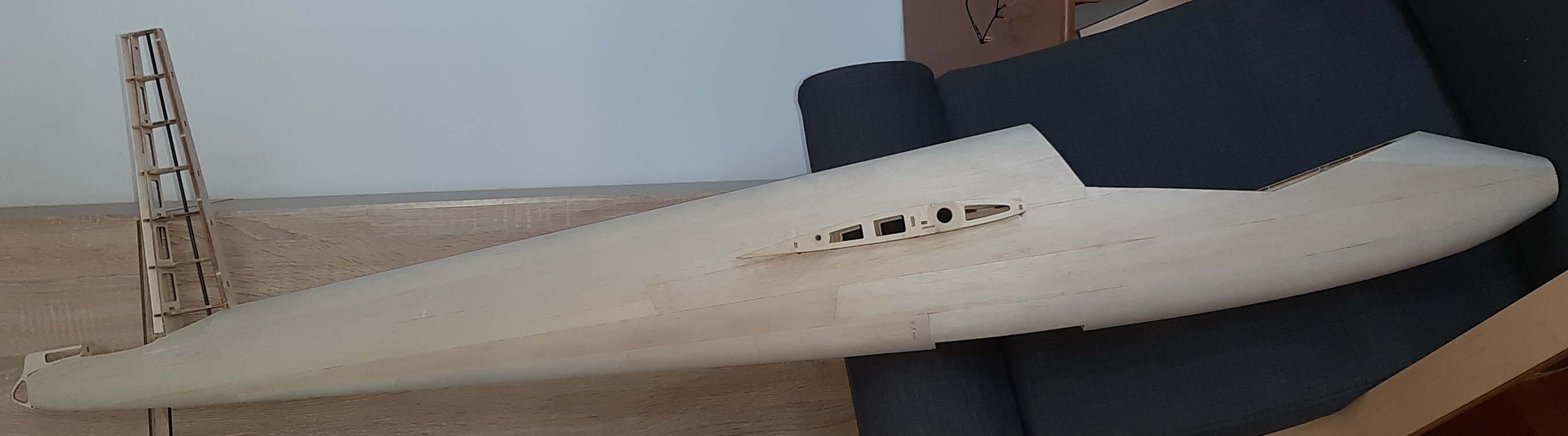 Zamówiłem balsę 1,5mm w Conradzie. Okazała się być całkiem niezła więc wykonałem pokrycie statecznika pionowego. Wcześniej wkleiłem zawiasy. Dodatkowo z zakupionej półtorówki zrobiłem pokrycie steru kierunku. Cały kadłub wstepnie przeszlifowałem, przemalowałem cieniutką warstwą żywicy. Żywicą wymalowałem również wewnętrzną cześć kabiny w celu utwardzenia balsy w szczególności miejsca w którym będzie wklejona płoza. Po związaniu żywicy przeszlifowałem delikatnie kadłub i pokryłem warstwą mikrobalonu z żywicą L285. Doskonale wypełniły się wszystkie szparki przy łączeniu klepek itp. Niestety, taka szpachla pomimo że lekka jest dość trudna w szlifowaniu wymaga trochę pracy. Jutro się za to zabiorę. Po szlifowaniu położę na całość tkaninę i zalaminuje.