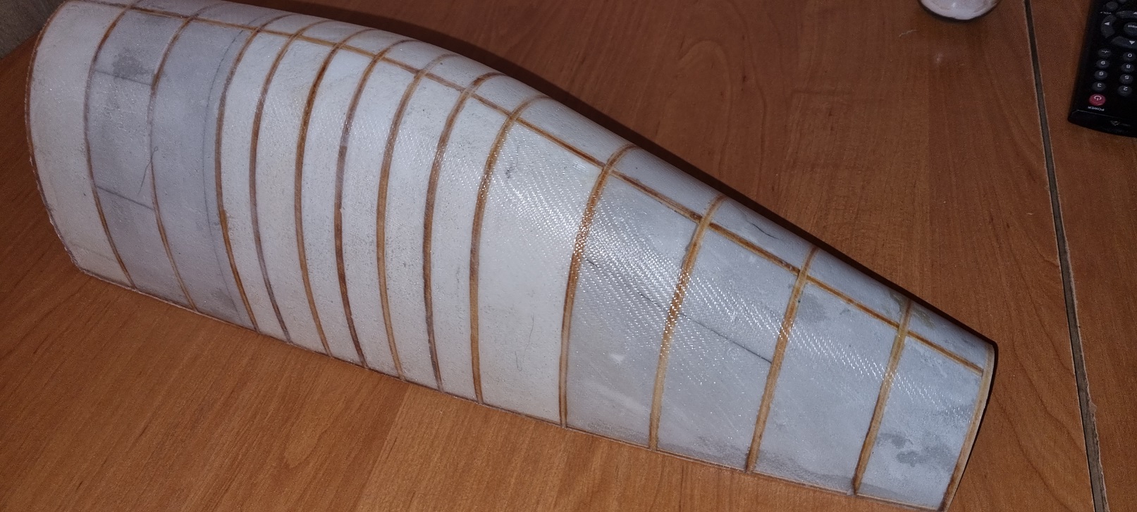 Oszlifowałem końcówkę kadłuba. W zasadzie przed jego laminowaniem wstrzymuje mnie wnęka podwozia i wręga silnikowa. Trzeba to dopracować. Tu nie pogonię, model robię w kuchni i muszę się liczyć z rodziną.