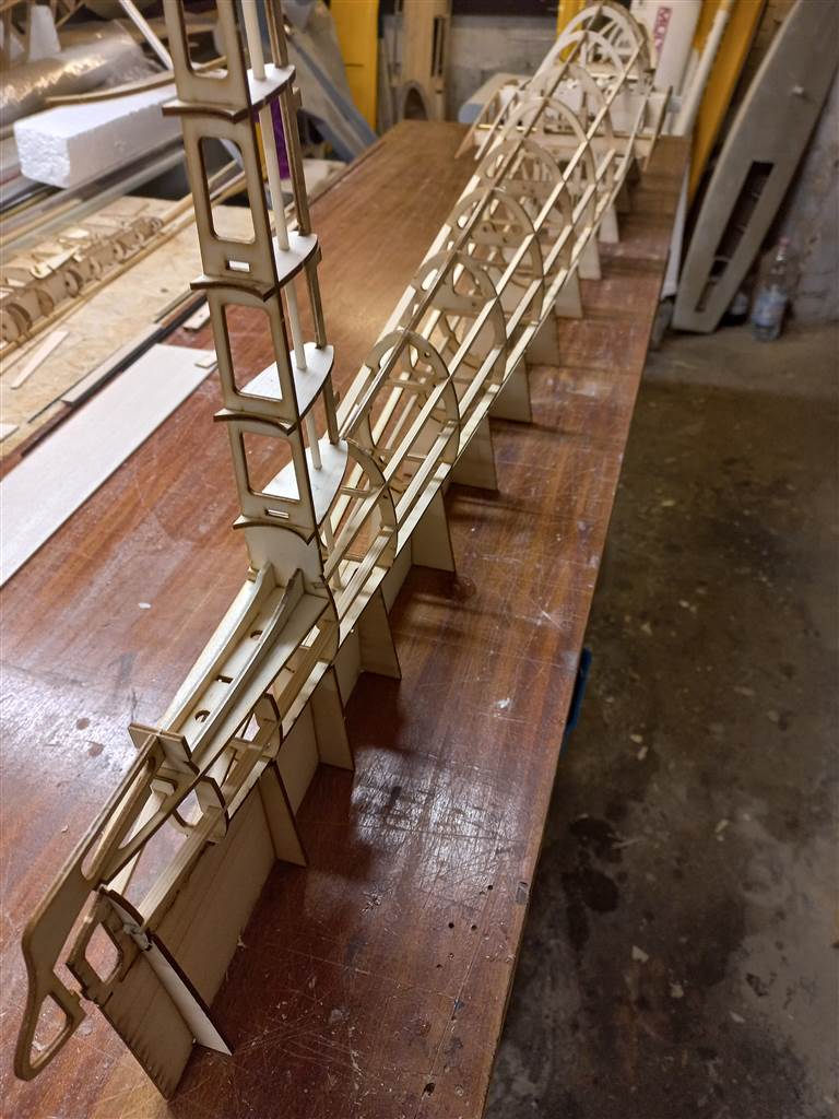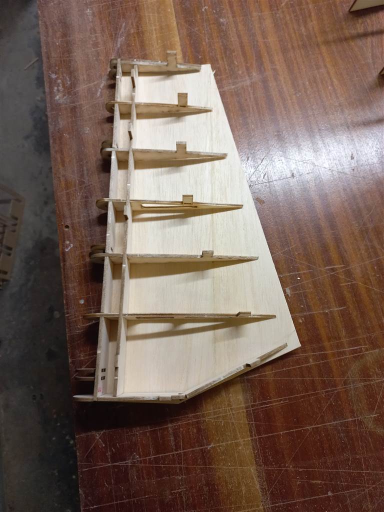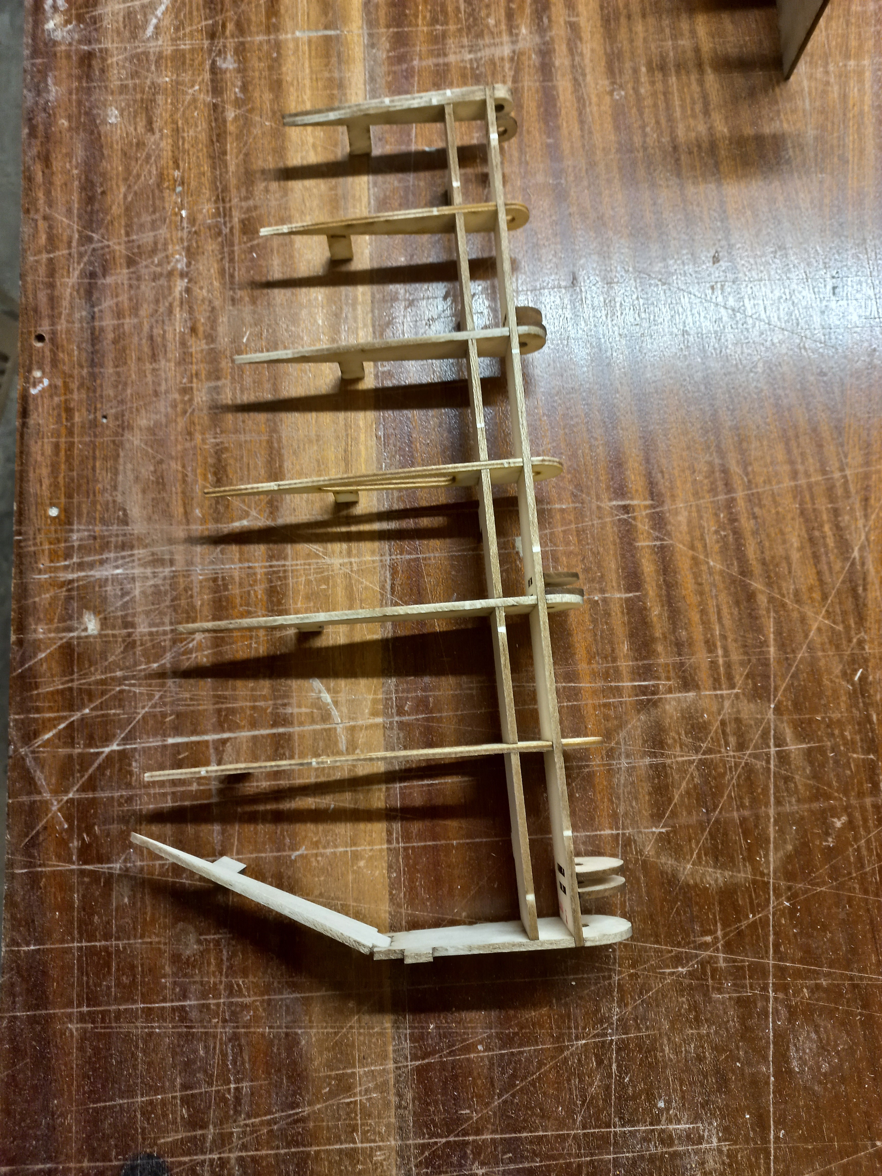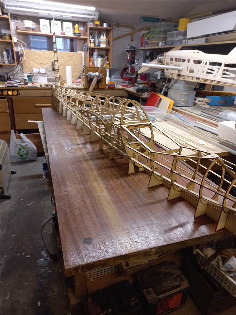 Konstrukcja kadłuba sklejona czeka na pokrycie balsą.