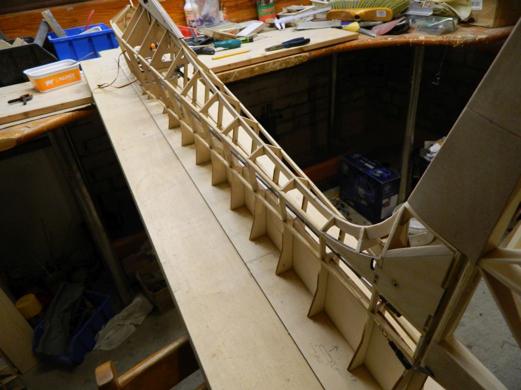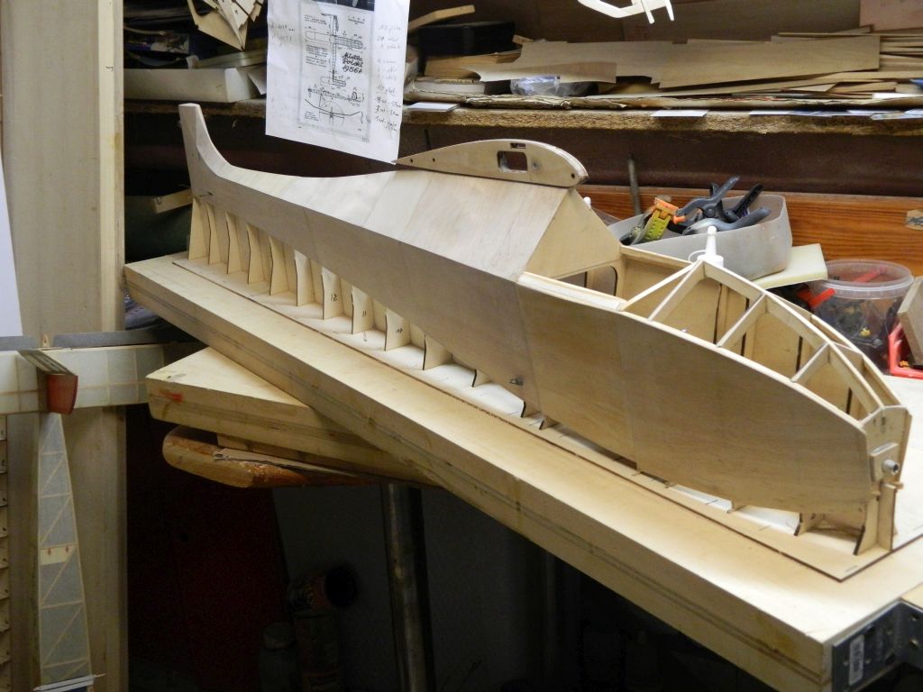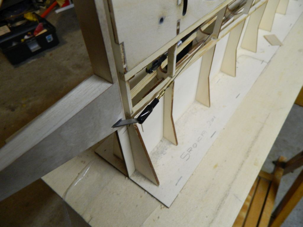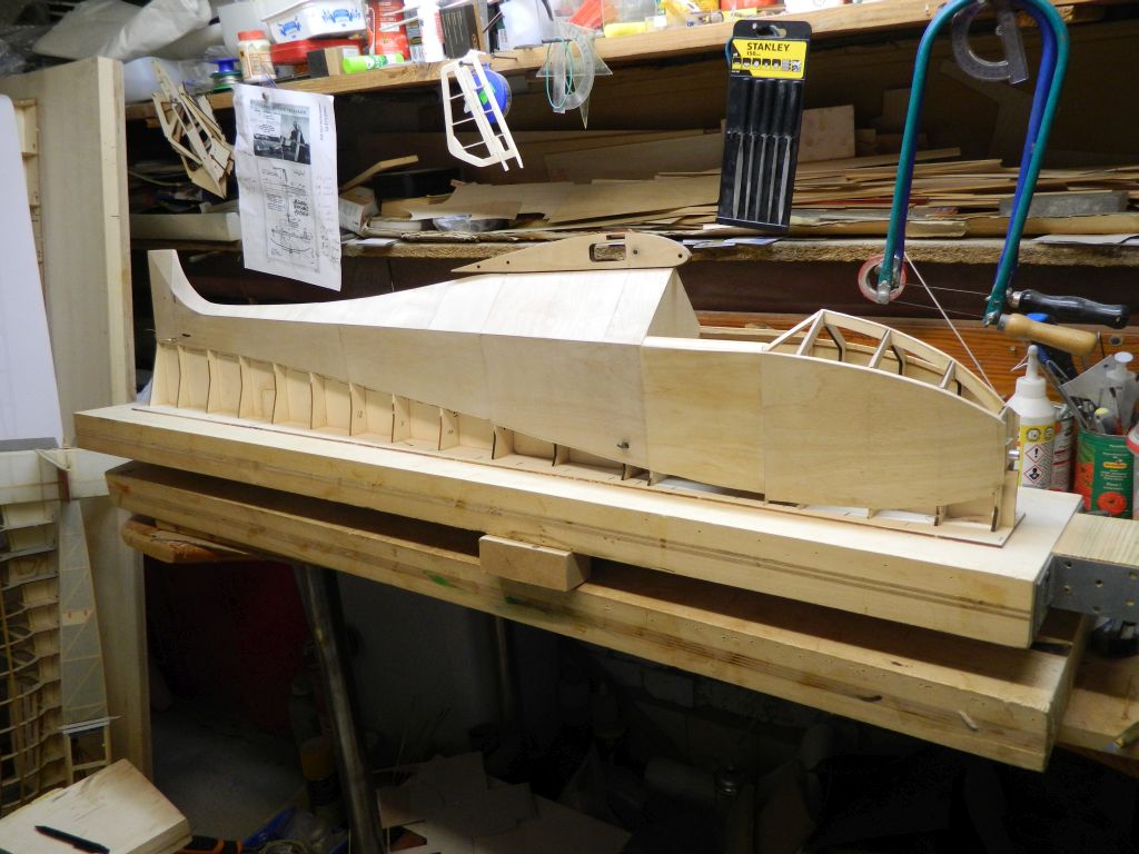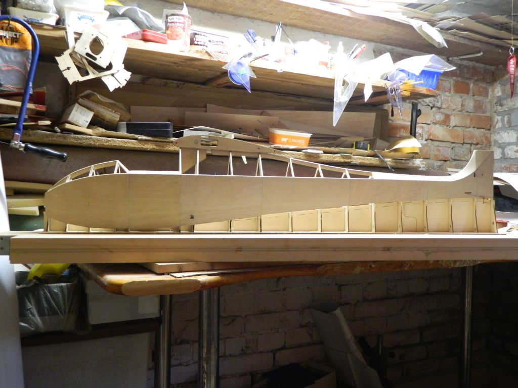 Oszlifowałem podłużnice kadłuba, wyrównałem do wręg, zamocowałem serwa i podłączyłem stery. Sprawdziłem czy napędy działają dobrze, wyznaczyłem wyjście linek od sk z kadłuba. Sprawdziłem czy mam sklejkę na pokrycie kadłuba. Jutro mam nadzieję , zacznę pokrywać kadłub. Zbieram kasę na sklejkę lotniczą 0,6 mm AB-AB z ModelMaking, sprzedają w dużych arkuszach. Dlaczego taka? Otóż jest to sklejka najwyższej jakości i super się wygina. Ma być na kesony. Tak mi podpowiedział kolega od "dużej Sroki" :D .