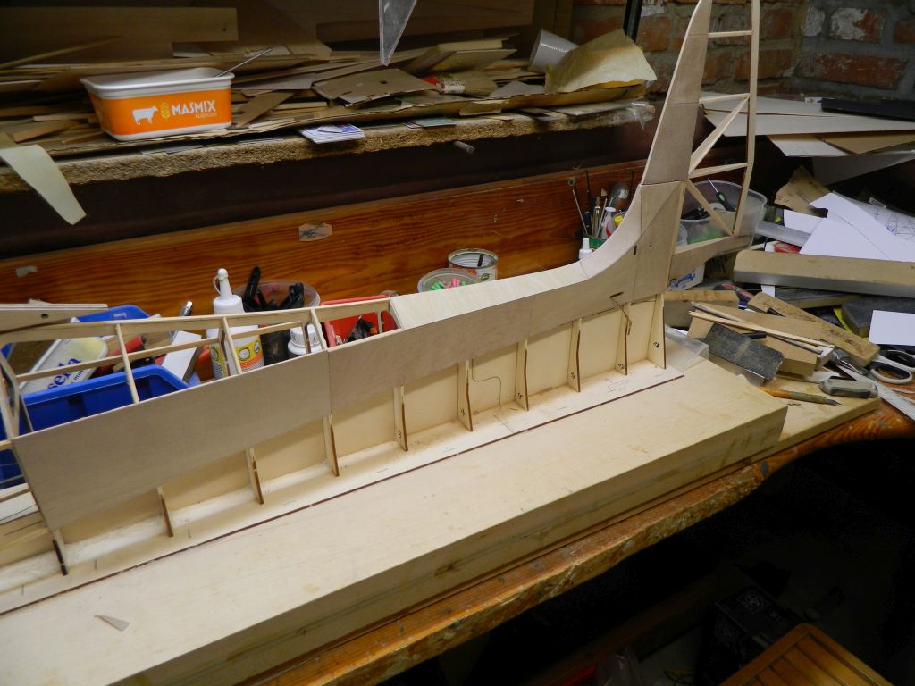 Po pokryciu sklejką drugiej strony piramidki można było ściągnąć kadłub z deski i odciąć od stelaża montażowego. Tutaj muszę się przyznać do błędu. Źle zaplanowałem mostki. Nie wdając się w szczegóły, było ciężko. Mostki powinny być odwrotnie od tych co są w modelu. Takie umiejscowienie dość mocno utrudnia odcinanie bez uszkodzenia części wręg. Trzeba się postarać.