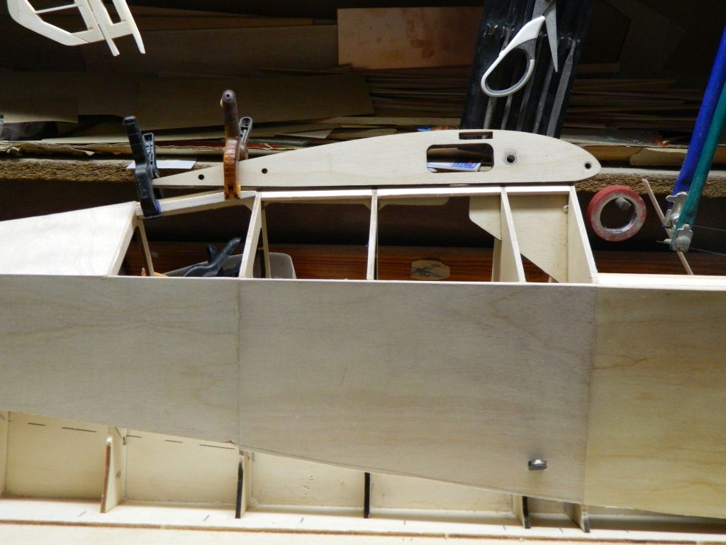 Początek oklejania kadłuba. Zaczynam od ogona, moim zdaniem najtrudniejsza faza oklejania. Z brystolu zrobiłem szablony brytów pokrycia, przeniosłem na sklejkę, nożyczkami powycinałem, klej i zrobione. Jak oklejałem? Powiedzmy , hybrydowo. Klej to Soudal 66 lub 64, szpilki, ściski a w przypadku kleju 64 A, żelazko na koniec. Każdy ma swoje metody. Mam za sobą 50% najtrudniejszej pracy przy kadłubie. Jakoś to wygląda, dla mnie do przyjęcia ;) . Zostało dopieścić otworki i połączenia. Ciężko się klei takie elementy, trzeba dobrze się przygotować a przede wszystkim dobrze docinać bryty sklejki. Wszystkie kawałki klejone na "fazę".