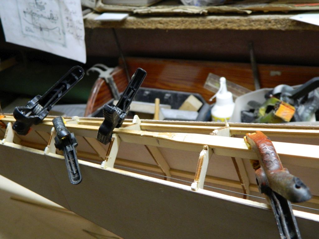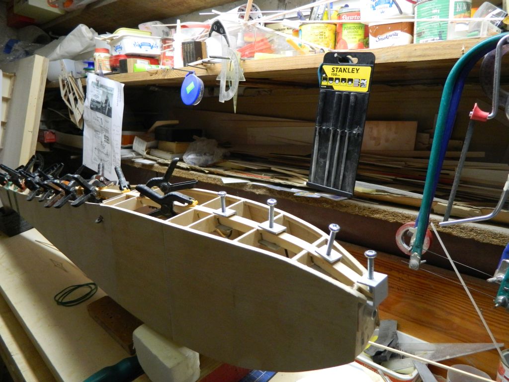 Na spodzie kadłuba przewidziałem trzy podłużnice. Dzisiaj wkleiłem pierwszą, centralną. Od nosa kadłuba do około połowy przestrzeni między 10 a 11 wręgą, sosna 8x2. Dalej płynnie przechodzi w sosnę 3x2. Jak wkleić dwie pozostałe podłużnice pokażę w następnym wpisie.