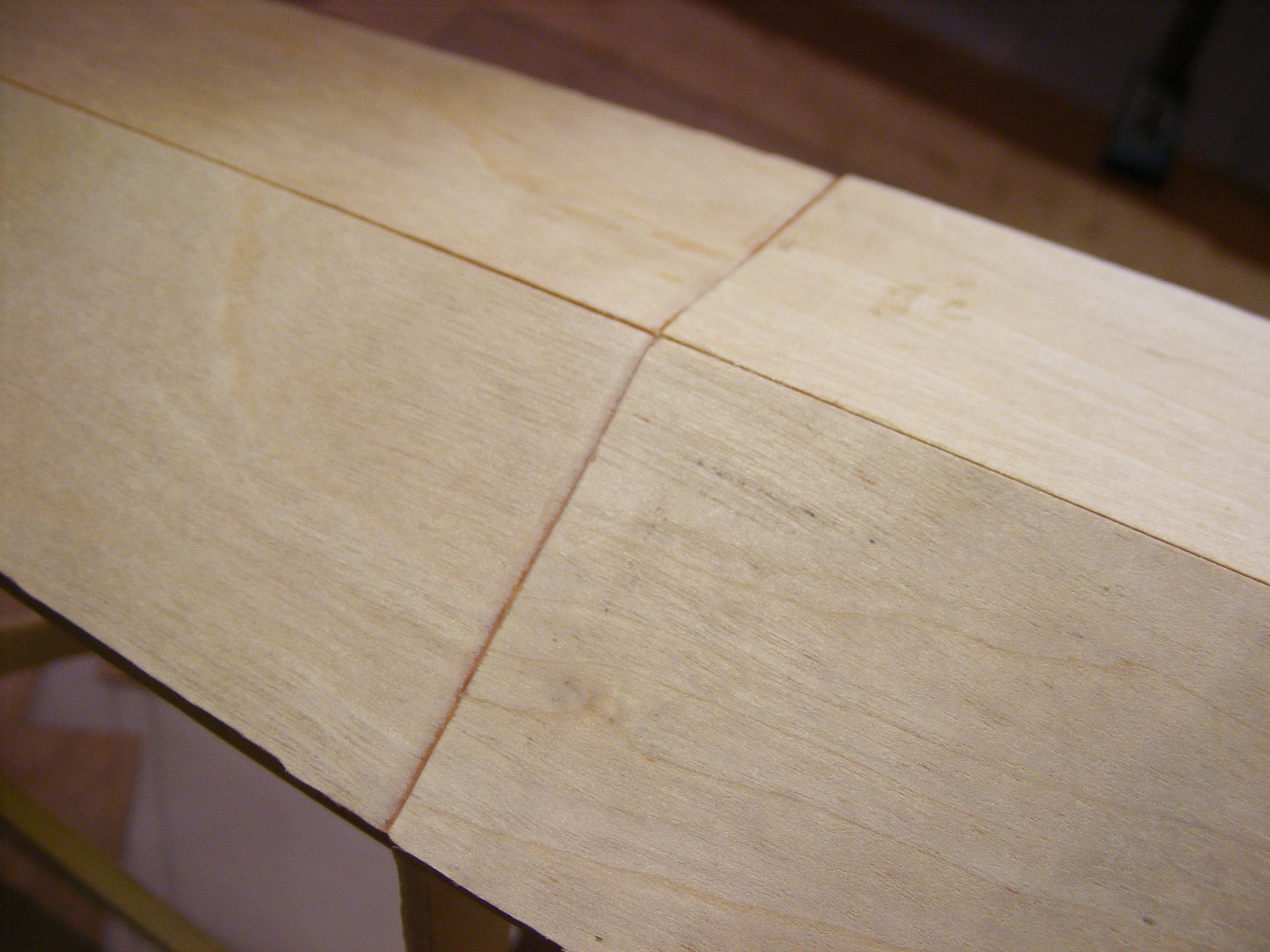 Okleiłem częściowo spód kadłuba sklejką 0,6 mm . Kleję metodą " na zakładkę " tak jak kesony skrzydła przy użyciu kleju Poxipol , korzystając z super wyrafinowanego oprzyrządowania