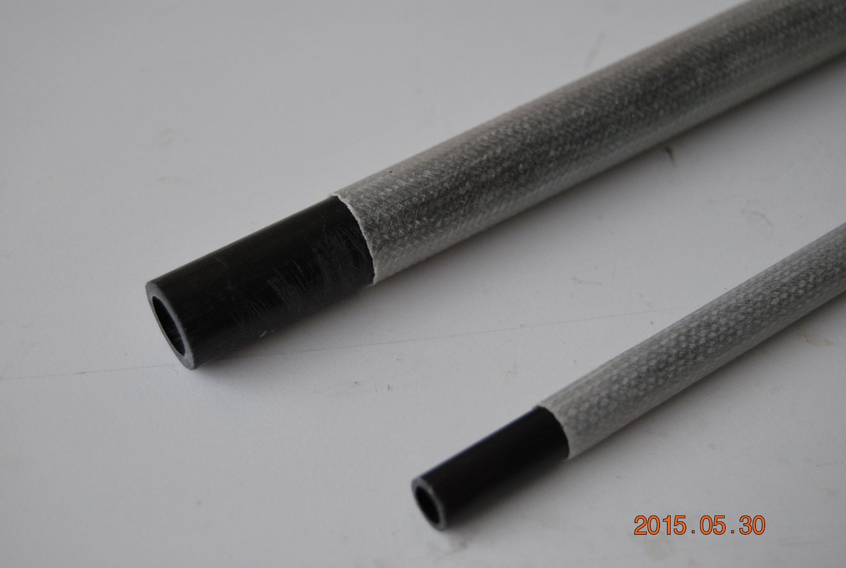 Łączniki płatów to rurki węglowe o średnicach: 14mm/ścianka 2mm oraz 8mm/ścianka 1mm. Na zdjęciu są jeszcze nie przycięte. 14mm będzie miał 70cm długości, 8-mio milimetrowy 52cm. Raczej nie ma szans na złożenie się skrzydeł.