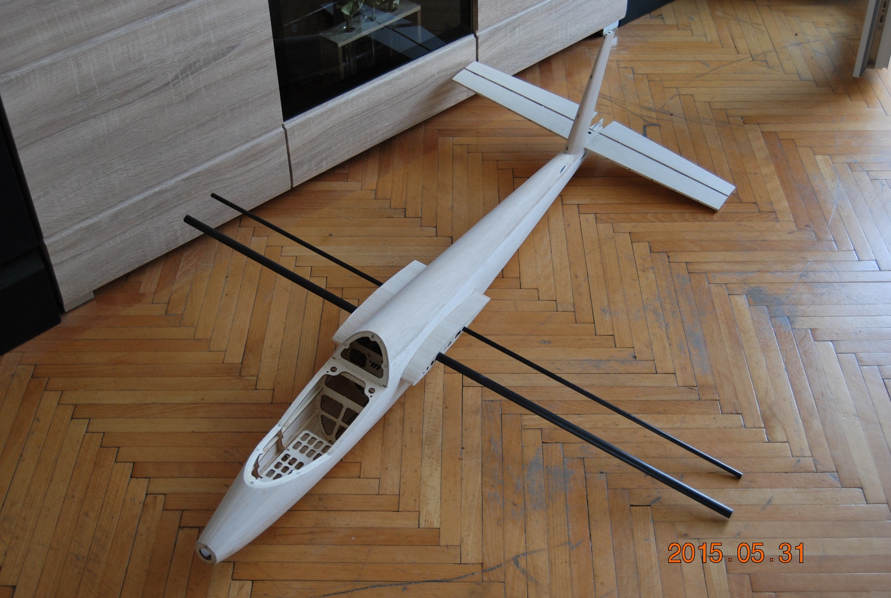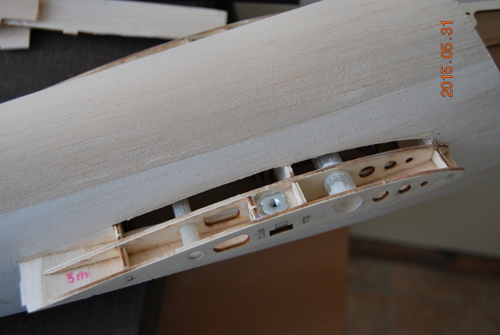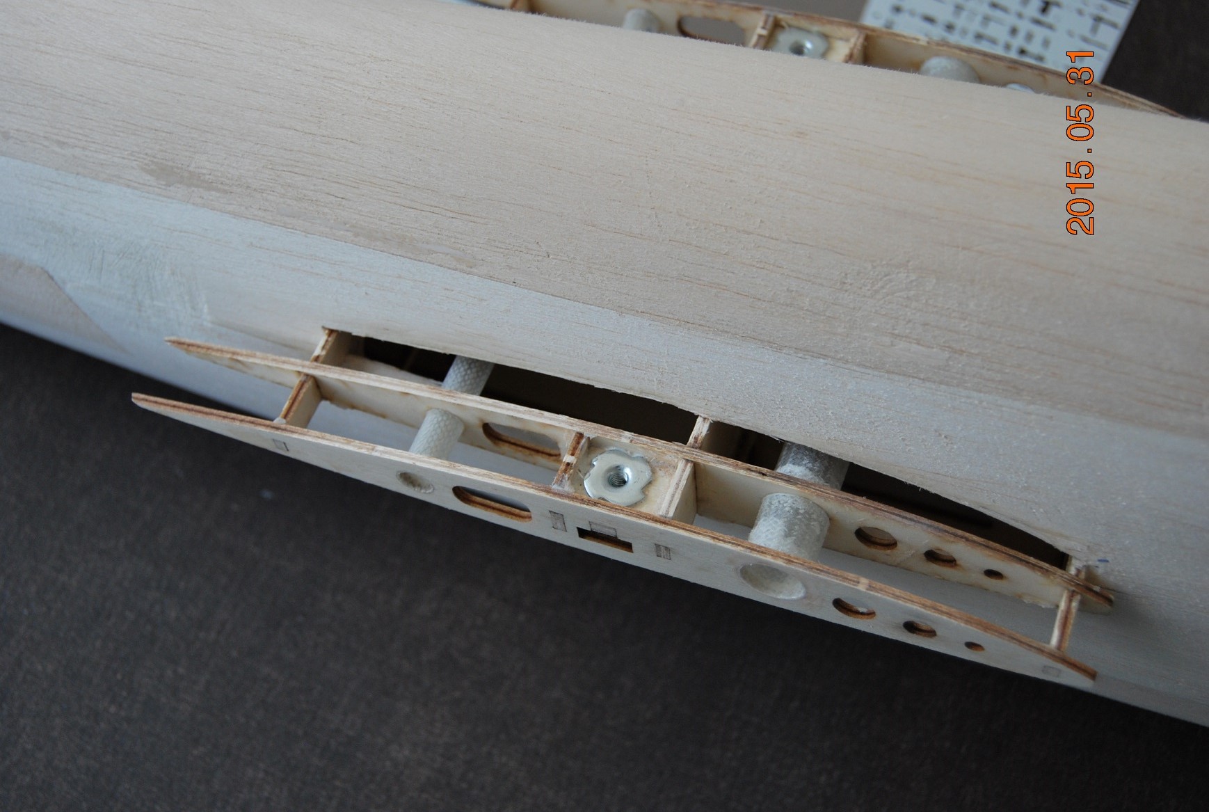 Kolejną sprawą było wklejenie żeberek centropłata że tak go nazwę kadłubowego. Zanim jednak skleiłem skrajne żeberka wkleiłem półeczki z nakrętkami kłowymi mocowania płatów. Będą tam jeszcze wypełnienia balsowe ale o tym później. Po wklejeniu półeczek skleiłem skrajne żebra a następnie wkleiłem kieszenie łączników płatów. Na koniec wypełniłem wszystkie szczelinki kadłuba distalem a jutro generalne szlifowanie.