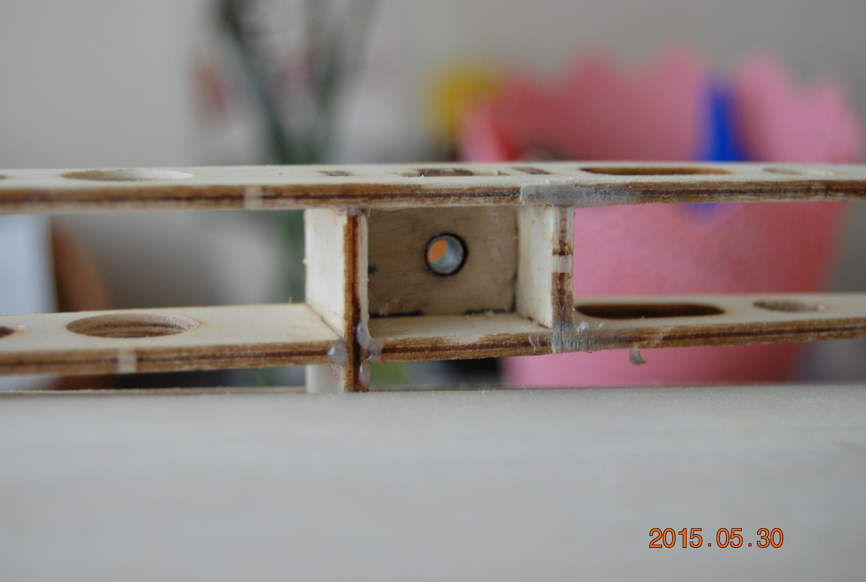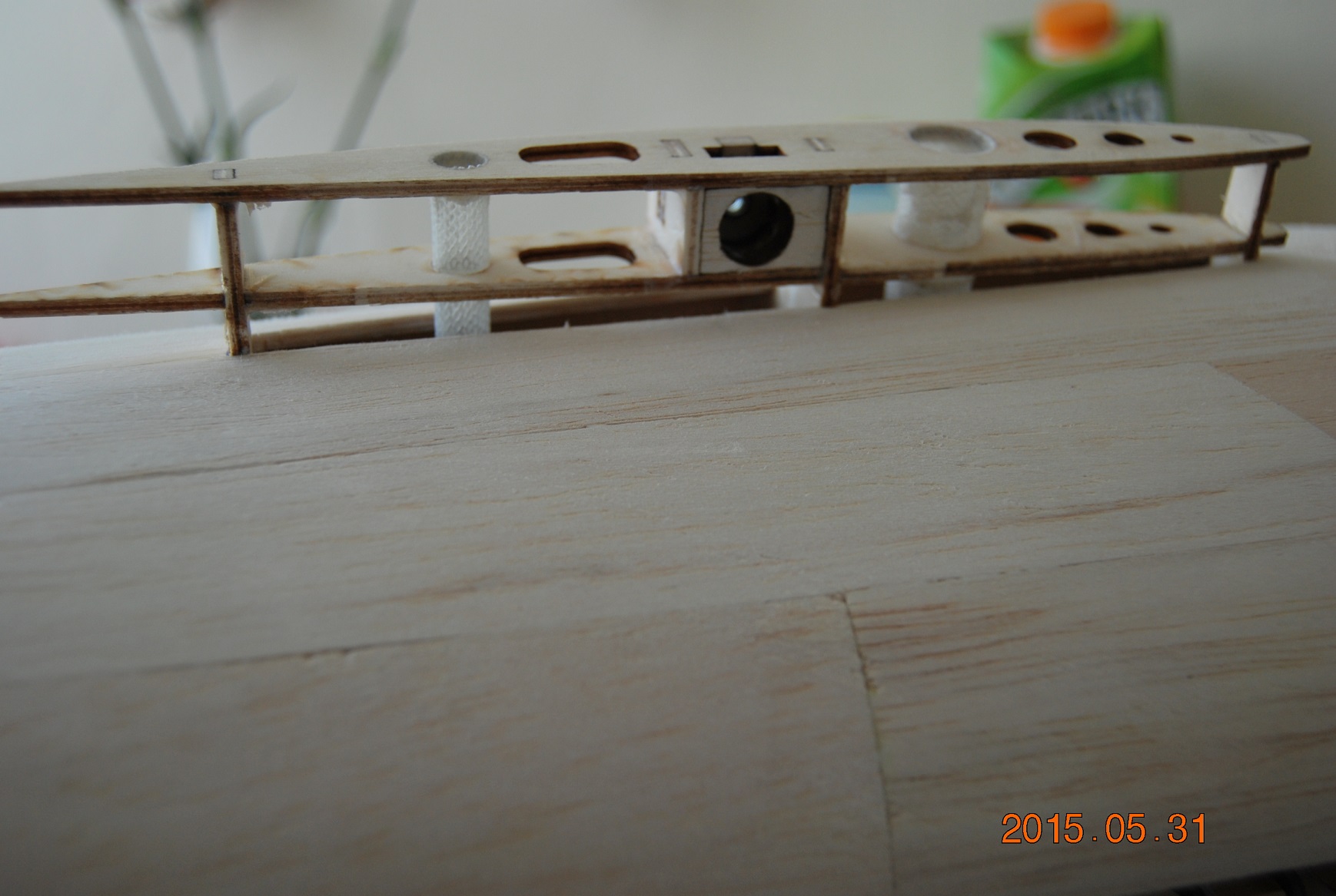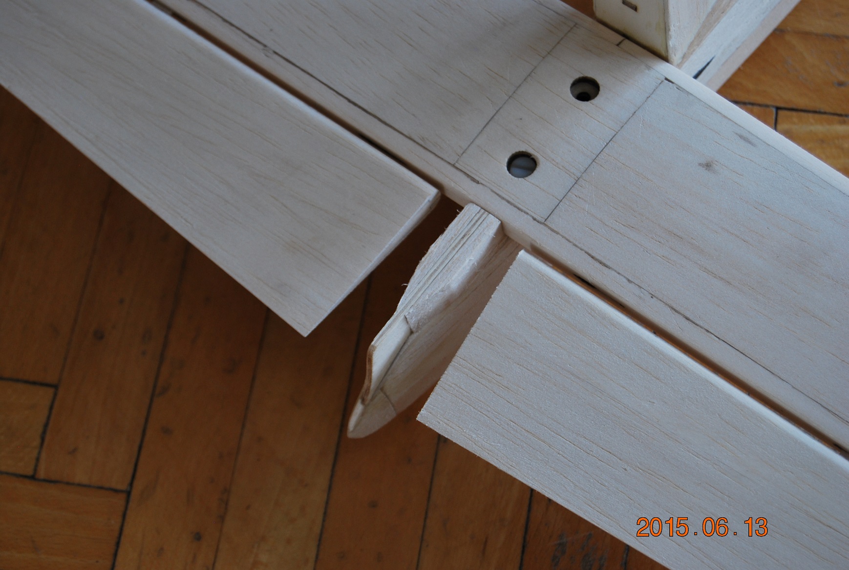 Kolejną sprawą było wklejenie żeberek centropłata że tak go nazwę kadłubowego. Zanim jednak skleiłem skrajne żeberka wkleiłem półeczki z nakrętkami kłowymi mocowania płatów. Będą tam jeszcze wypełnienia balsowe ale o tym później. Po wklejeniu półeczek skleiłem skrajne żebra a następnie wkleiłem kieszenie łączników płatów. Na koniec wypełniłem wszystkie szczelinki kadłuba distalem a jutro generalne szlifowanie.