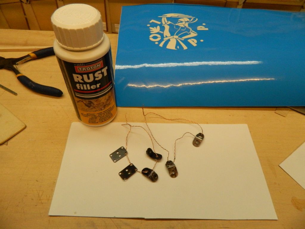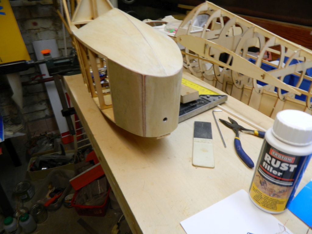 Gondola z góry , przód i tył pokryta sklejką. Wyszło tak sobie. Źle zaplanowałem podział brytów sklejki i wyszło tak jak wyszło, najwyżej pomaluje się "mordkę" ;) . Jutro bejcowanie wszystkich elementów poza kabinką, montaż linek i regulacja i można zamykać pokrycie. Zabezpieczyłem pewnym specyfikiem elementy stalowe mocowania zastrzałów i linek. Fajny efekt, blaszki mają kolor czarny z lekkim granatowym odcieniem. Wszystko pokazałem na zdjęciach. Pracuję nad szablonami loga LOPP, są z folii i pomaluję aerografem czarną farbą nitro. Taki jest plan. Z niewielu rzeczy jestem "dumny" w tym modelu, jednak otwór na linkę holowniczą bardzo mi się podoba :lol: z tego mogę być chyba "dumny" ;) .