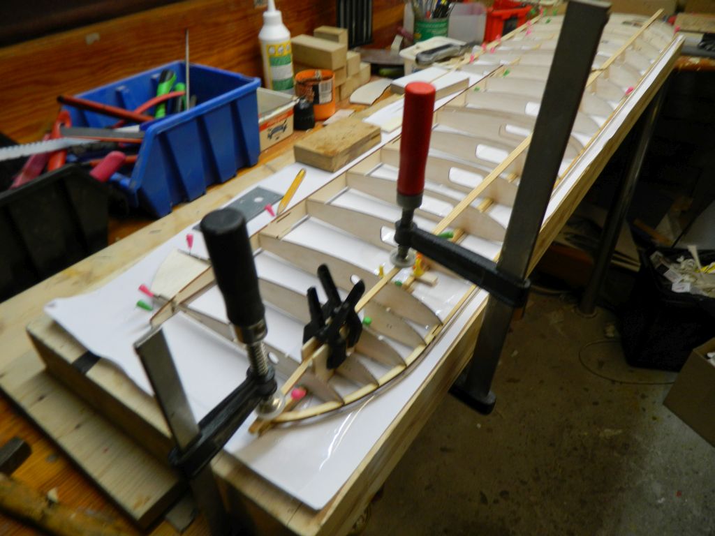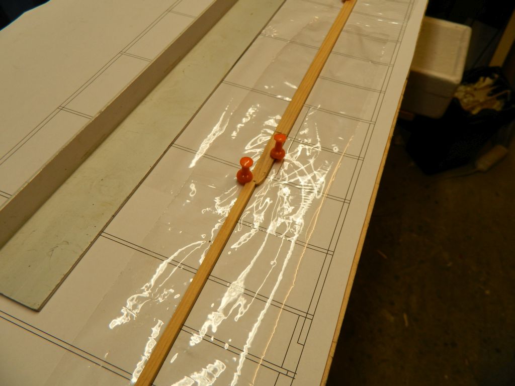 Jedna podłużnica na miejscu. To lamela z dwóch listw 5x2. Klejenie na klej poliuretanowy. Teraz oceniam, że za grubo je zaprojektowałem, kłopot z wygięciem. Co prawda moczyły się w wodzie i w miarę poszło, ale moim zdaniem są za masywne. Teraz dałbym 2 razy listwę sosnową 4x2 lub jedną grubszą i balsę. No ale jest jak jest. Może dzisiaj przykleję drugą. Zobaczymy.