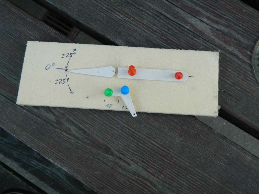 Postanowiłem, że w ADW-1mAkro będzie statecznik poziomy dzielony z podziałem na ster. Kilka minut zabawy z nożyczkami i "wymyśliłem" coś takiego......powiedzmy, że wymysliłem ;) . Czerwone pinezki to miejcsa łączników statecznika, niebieska oś obrotu steru i orczyka SW, zielona pręt napędzający SW....coś jak w pływającym steteczniku. Oczywiście to jest narazie sama koncepcja, bez skali i wymiarów precyzyjnych.