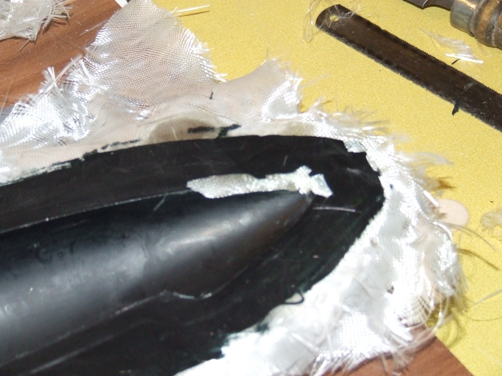 No dobra - krok dalej - poniżej kilka zdjęć, ale pokrótce opiszę co się działo. Zrobiłem dwa podejścia do formy. Pierwsze niestety nieudane - żelkot pękał, tkanina nie doszła dokładnie do żelkotu - masakra, którą widać na dwóch zdjęciach - przy zdejmowaniu z kopyt popękało. Początkowo myślałem, żeby naprawiać tą formę, ale nie dało rady, żelkot pękał dalej. Niestety dodatkowo - technologia robienia kopyta kadłuba z dwóch połówek okazała się w moim przypadku porażką - nie udało się zrobić idealnego przejścia połówka-połówka. Krawędzie połowek są lekko podszlifowane, co powoduje, że negatyw - forma ma w tym miejscu rant. Przez to był problem ze zdjęciem pierwszej formy. Poza tym jest teraz spory problem z dokładnym i wzajemnym ustawieniem połówek to pierwsze i ostatnie kopyto tego typu. Cobra2 będzie robiona z całego kopyta na przekładce. Wogóle tak jak piszę - porażka. NA szczęście forma zeszła z kopyta praktycznie bez szwanku - lekko w jednym miejscu uszkodziła kopyto, jednak załatałem i spróbowałem w sposób bardziej przemyślalny podejść do drugiej formy. Starałem się zniwelować wszystkie problemy podejścia pierwszego i mam formę drugą. Ponownie idealnie zeszło z kopyt :) W sumie można zrobić trzecie podejście - pewnie forma była by idealna, bo teraz ma małe babolki - jak się uważnie przyjrzycie zdjęciom to w dolnej przedniej części kadłuba widać białe plamki - to dziurki w żelkocie na krawędzi formy. Próbowałem zeszlifować rant, i się ujawniły. jest ich kilka i małe, ale mimo to naprawię - po prostu zaleję CA i przeszlifuję te miejsca. Forma przeszlifowana na mokro papierem 800 potem 1500 i spolerowana - na zdjęciach nie widać, ale lusterko wyszło.