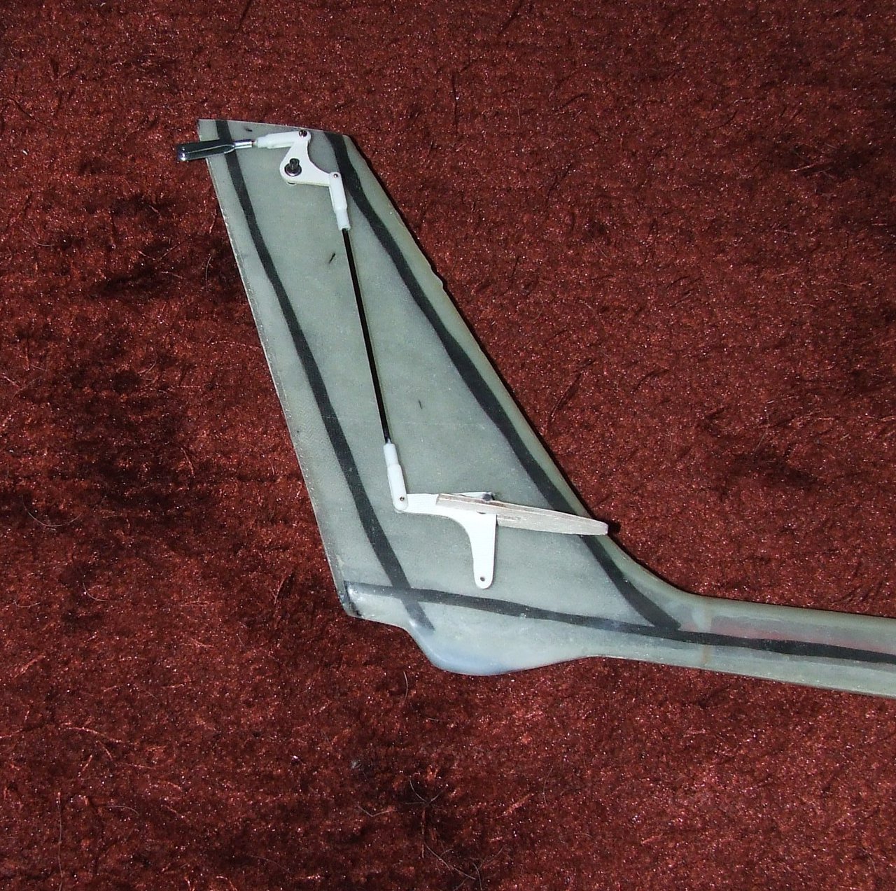 Rozwiązanie napędu steru wysokości - w kadłubie jest poprowadzony prosty bowden, który będzie podczepiony pod dolną dźwignię. Całość łożyskowana, chodzi gładko i bezluzowo. W tej chwili wklejone w ogon. Statecznik miał być płytowy, jednak po konsultacjach w tym egzemplarzu zastosuję dzielony.