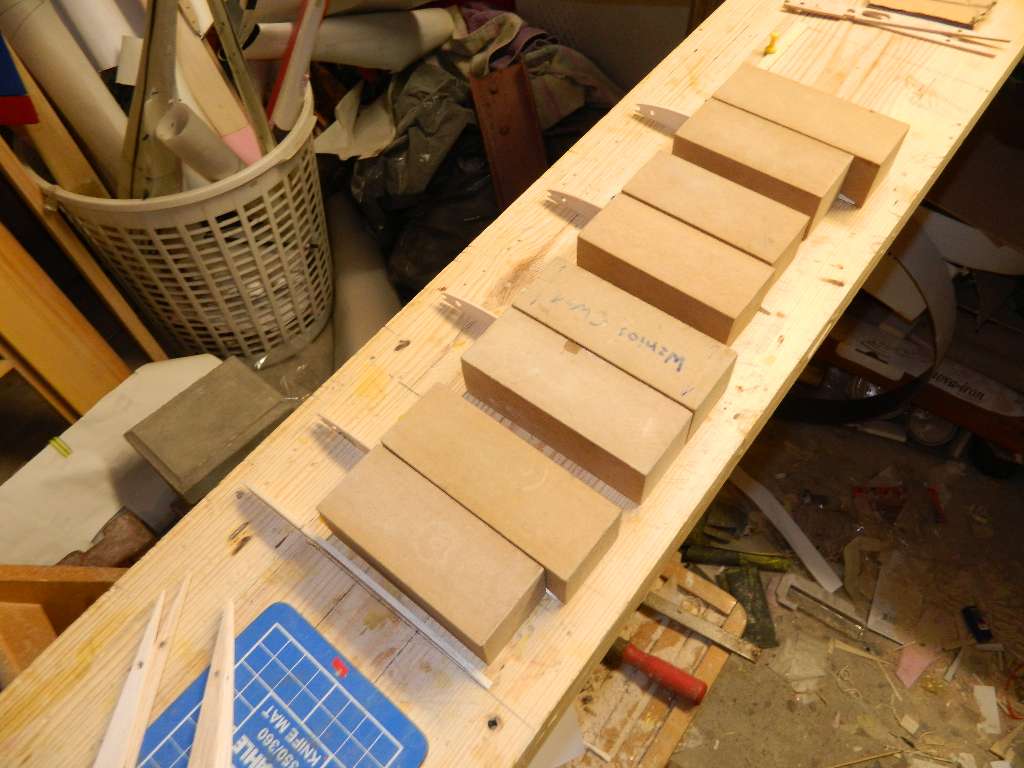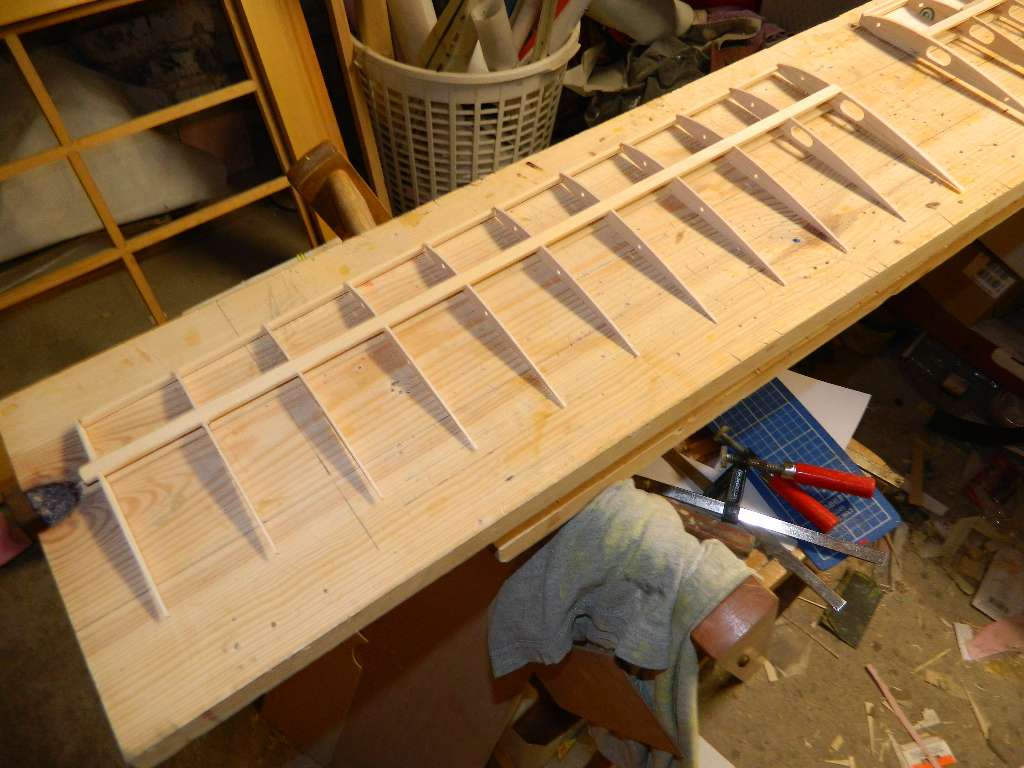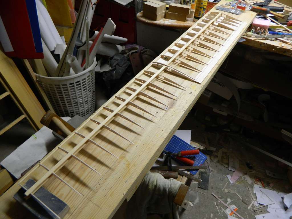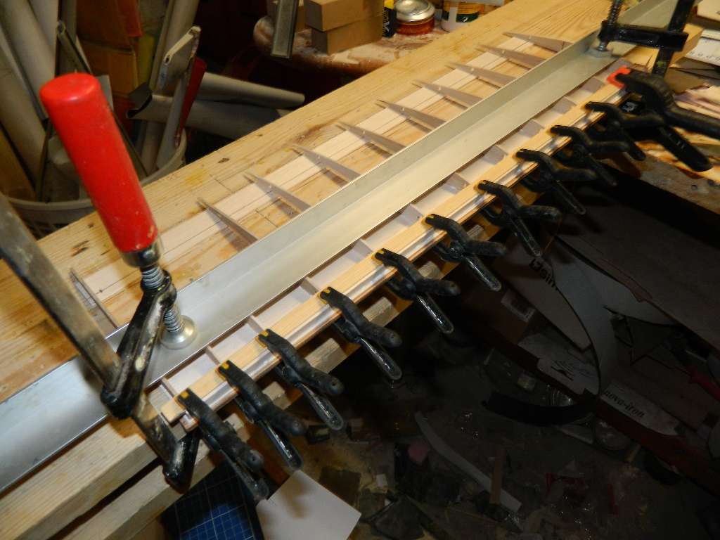 Delikatny postęp prac. Żeberka przyklejam stabilizując je kawałkami listew mdf, wszystkie kąty mają proste. Po zawiązaniu kleju /Soudal 64A/, wkleiłem listwę sosnową 3x3 w natarciu. Usztywnia to dość mocno wykonany kawałek płata. Żeberka od 1 do 3 nie są wklejone......czekają na pochewkę łącznika, ale o tym jutro.