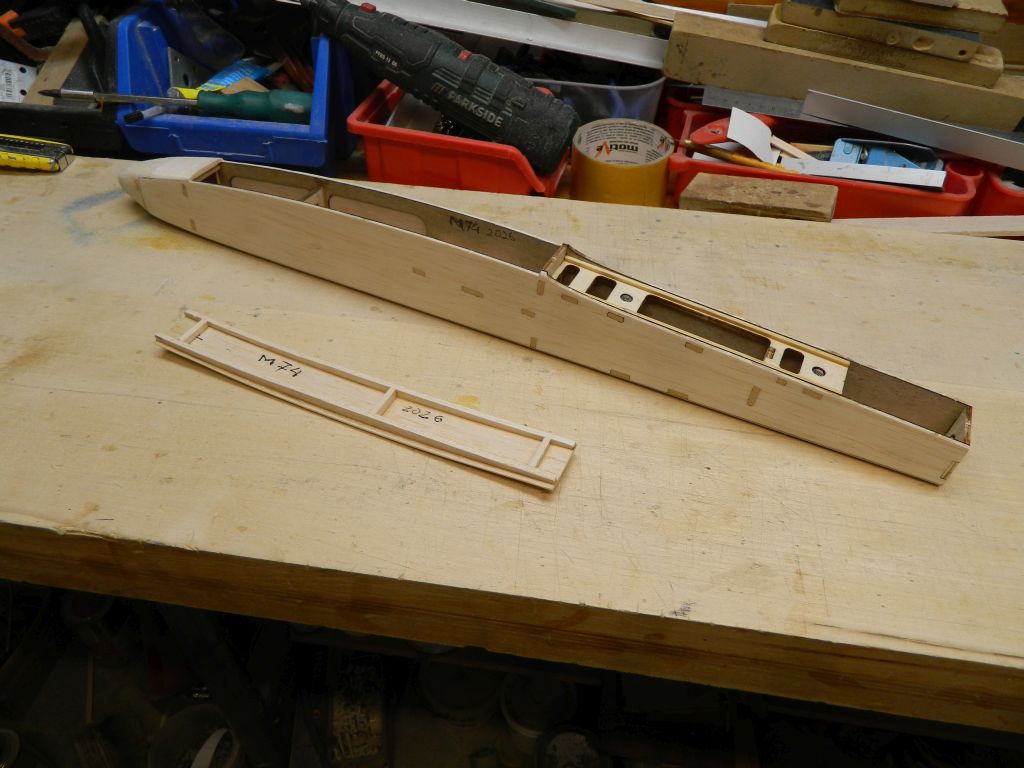 Kadłub, jego przednia część, sklejona. Dodałem w środkowej strefie kabiny małą wręgę usztywniającą. Zrobiona również osłona kabiny.