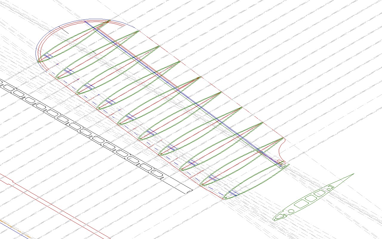 Może sie Wam przyda screen z mojego pola roboczego na którym rysuję skrzydło. Jak widać skrzydło jest w skali 1:1, wszystkie natarcia itp są pozaznaczane liniami konstrukcyjnymi. Dodatkowo poumieszczałem żebra w odpowiednich miejscach. Teraz mogę wygodnie wstawiać dźwigary spływy itp.