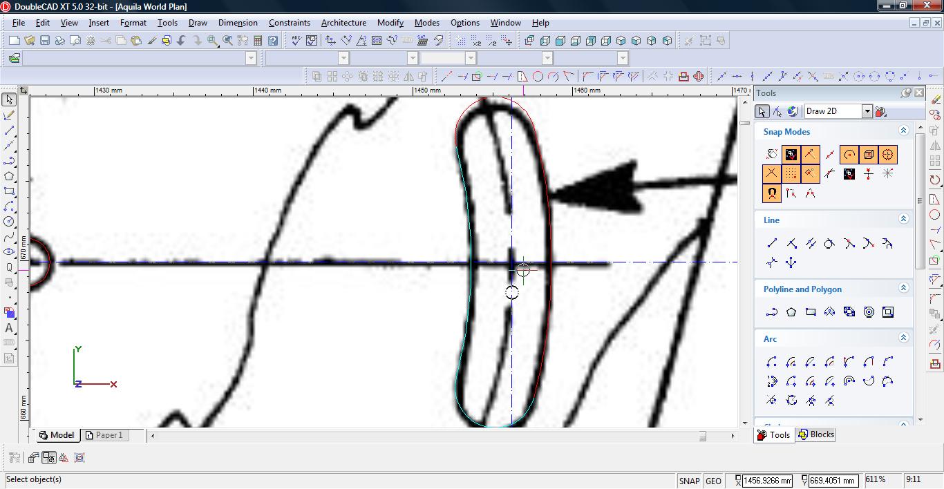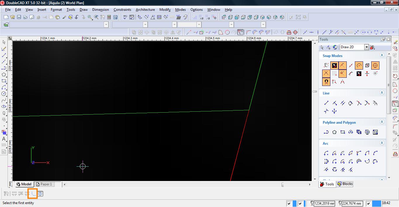 Teraz łączymy linię w pojedynczą polylinię. Wybieramy narzędzie Meet 2 Lines (Modify-> Meet 2 Lines)