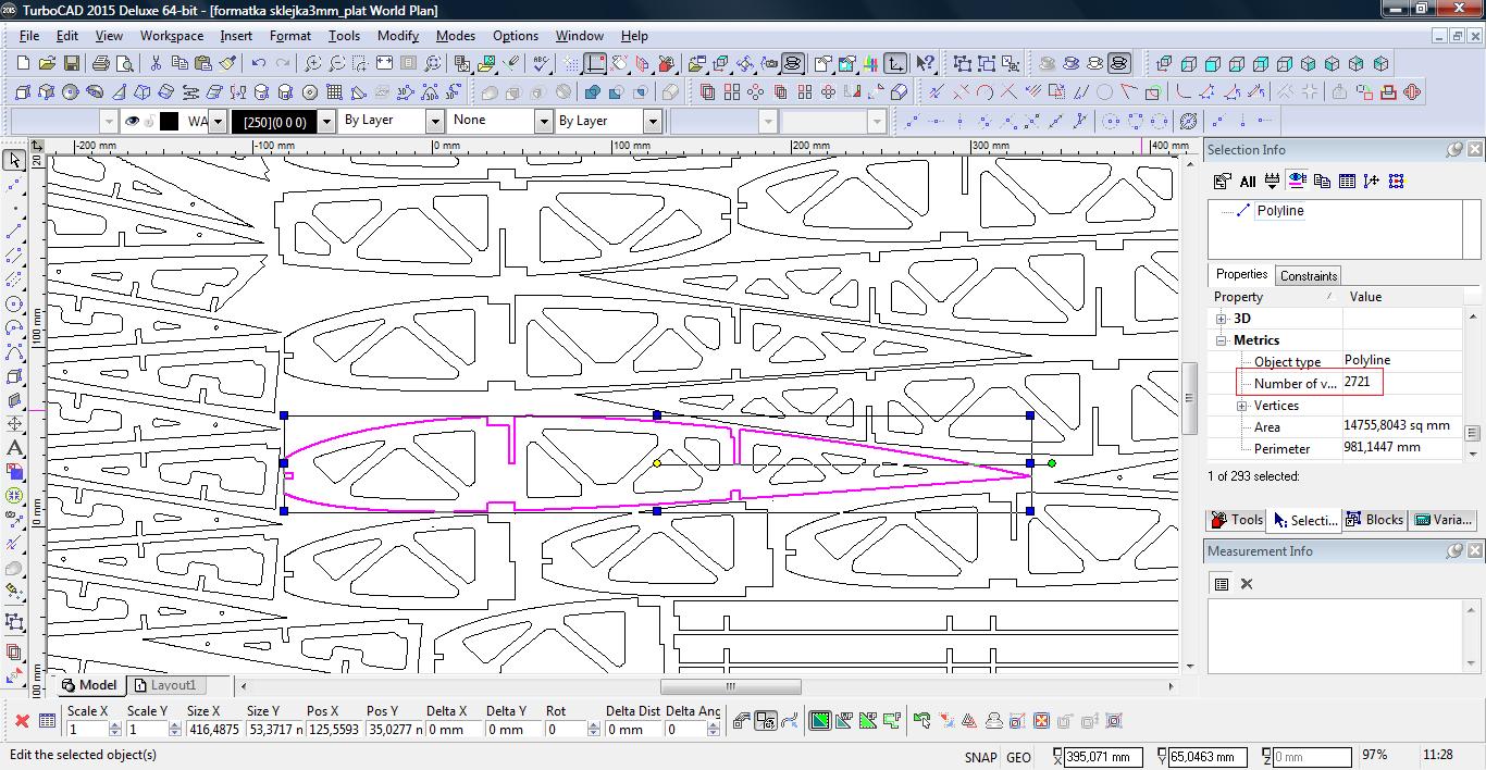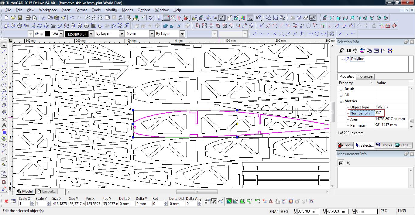 Plik jest zrobiony dość dobrze, linie są zerówkami. Typowy problem, wszystko jest splajnem i jakakolwiek próba edycji w programach CAD, trwa długo, oraz powoduje duży rozmiar pliku wyjściowego.