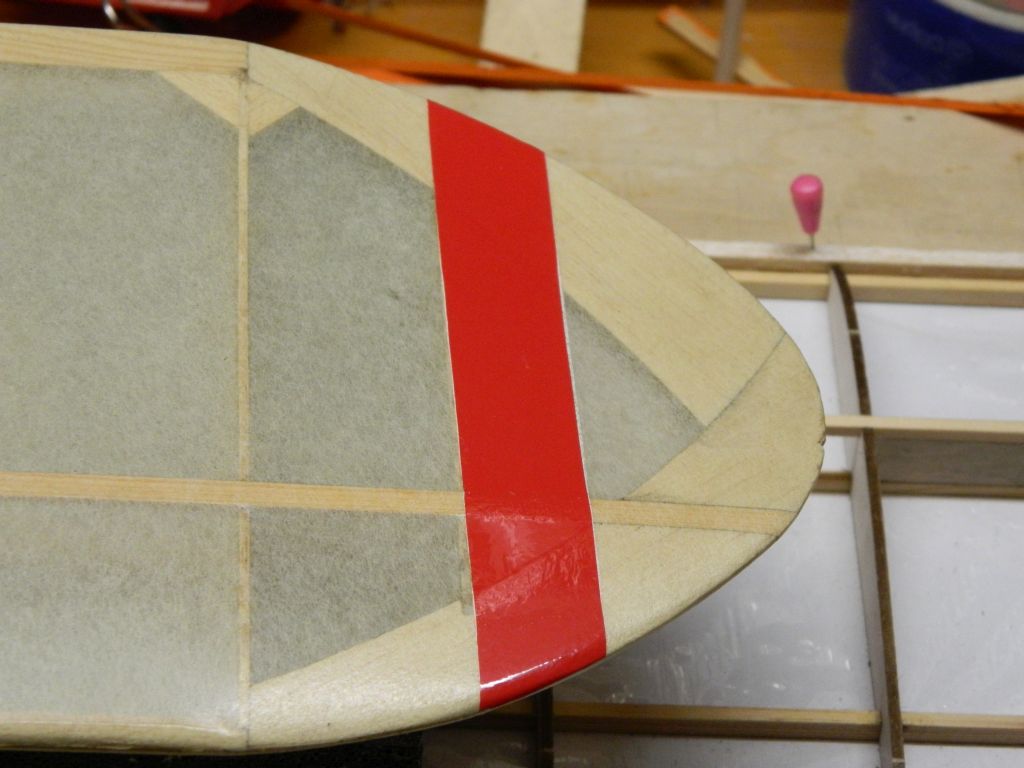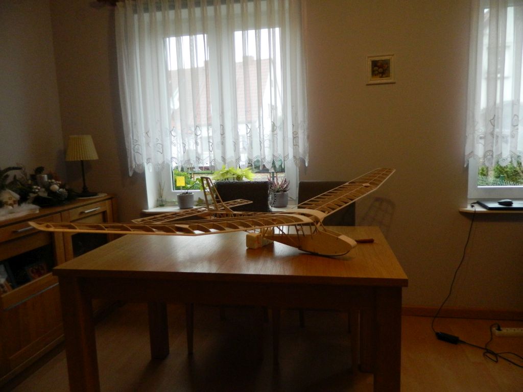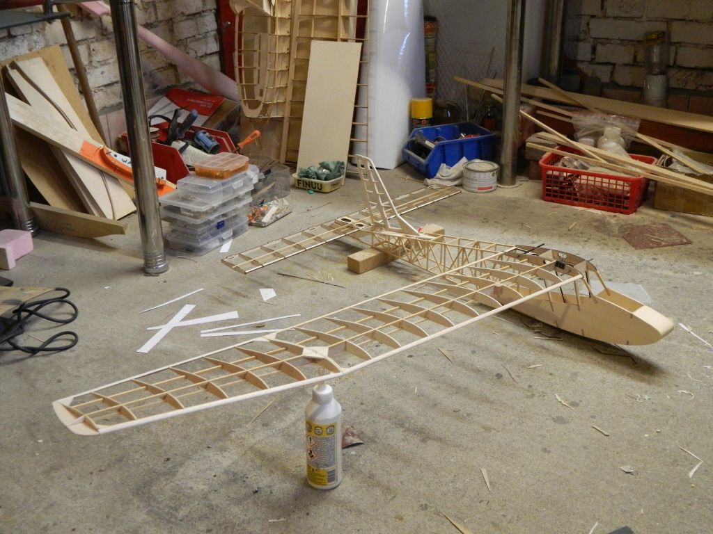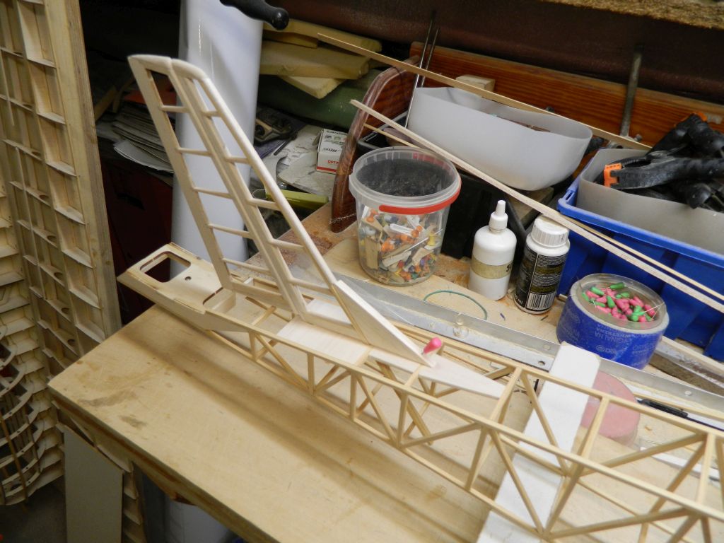 Skleiłem statecznik poziomy. Dźwigary to 2x listwa sosnowa 2x3. Reszta na formatkach. Centralna część statecznika wzmocniona kawałkami balsy. Zamocowałem również hak/podstawę płozy. Przednia część kadłuba, między sklejkowymi bokami od spodu wypełniona balsą /3 lub 4 mm/, wszystko oszlifowane do obrysu. Pionowy zasadniczo zrobiony. Dodatkowa płetwa przed pionem z balsy 5 mm. Na koniec przymiarka tego co mam.