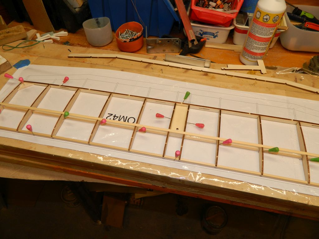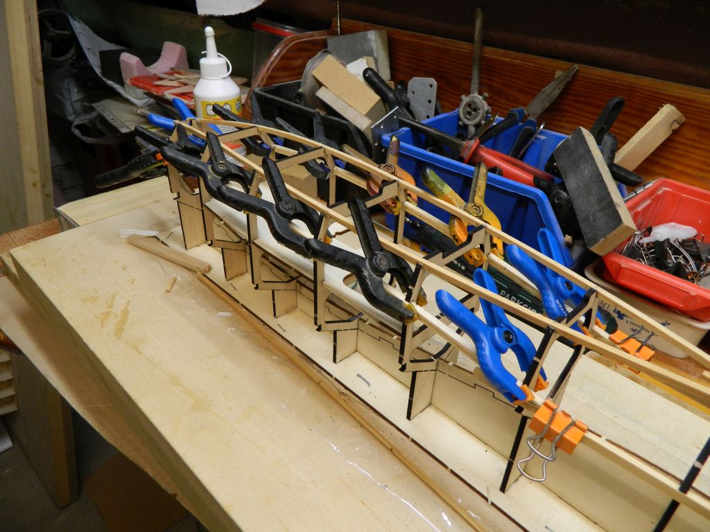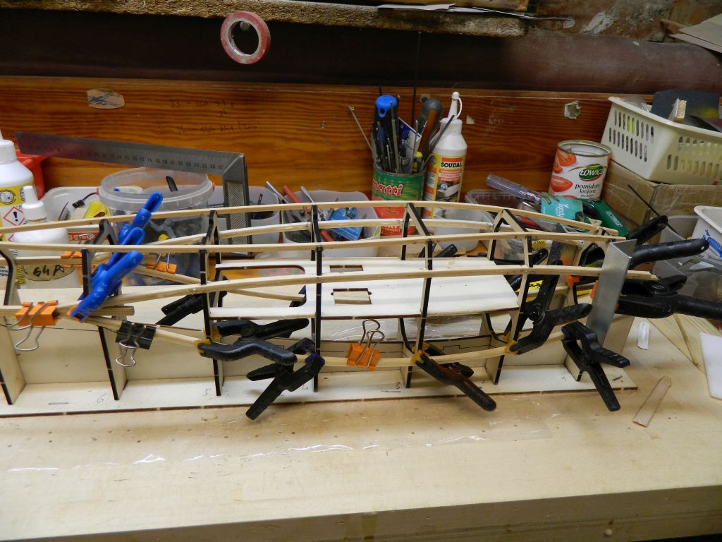 Dzisiaj przykleiłem podłużnice boczne części kabinowej. Są to lamelki z dwóch listew sosnowych 2x4. Wszystkie cztery sklejałem na wręgach stabilizując klamerkami. Proponuję robić jednocześnie prawą i lewą, góra, dół żeby uniknąć niewielkich naprężeń mogących lekko zwichrować kadłub. Coś pomieszałem z wpustami we wręgach, kilka jest za płytkich a kilka zbyt dużych. Nie są to jakieś wielkie wartości, może kilka dziesiątych mm, ale są. Sprawdzam na formatkach i poprawiam. Te moje błędy nie stanowią problemu w czasie sklejania, podłużnice wchodzą lekko i bez oporu. Półka pod serwa/pakiet nie jest jeszcze przyklejona.