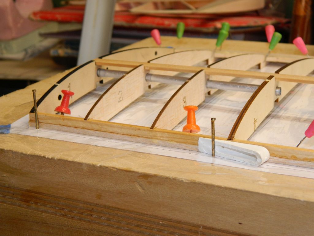 Wracam do kadłuba. Oddzieliłem go od stelaża montażowego. Należy uważać przy odcinaniu wręg z balsosklejki, dwie czy trzy delikatnie uszkodziłem. Powinny być mniejsze mostki, ale tak zostawię, nauczka na przyszłość. Do dolnej listwy ze sklejki przykleiłem listwę sosnową 2x3. Od strony statecznika należy ją fazować.